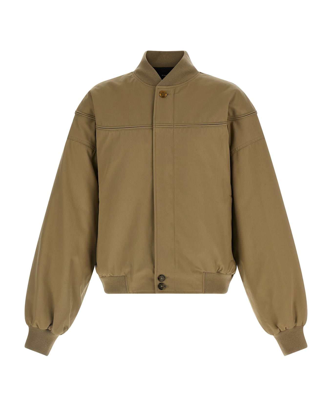 Gas Station' cotton canvas bomber jacket with quilted nylon lining, stretch ribbed knit inserts, front zip and button closure, pockets, long cuffed sleeves and dropped shoulders.