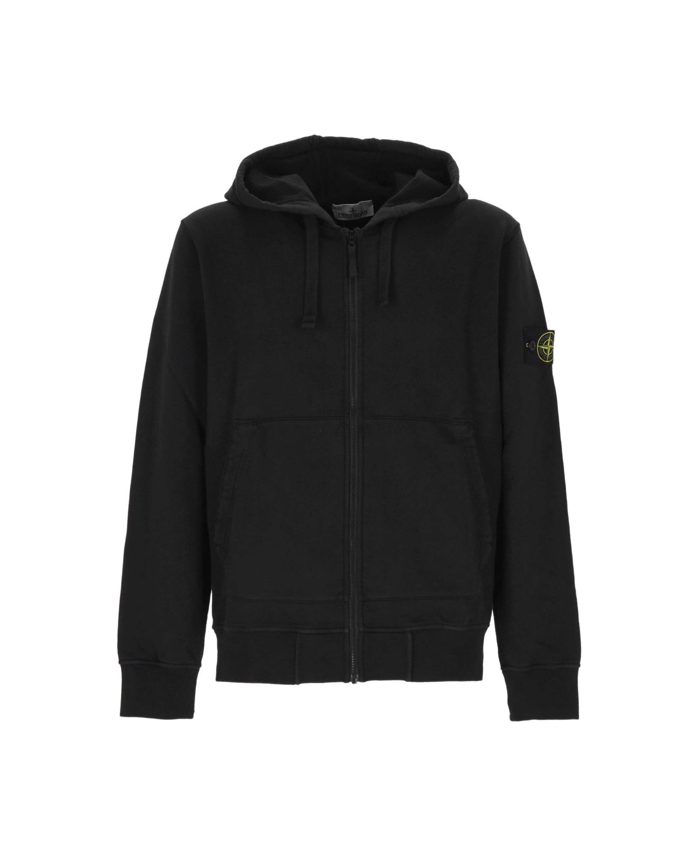 black drawstring hood zip fastening pouch pockets logo patch ribbed hem