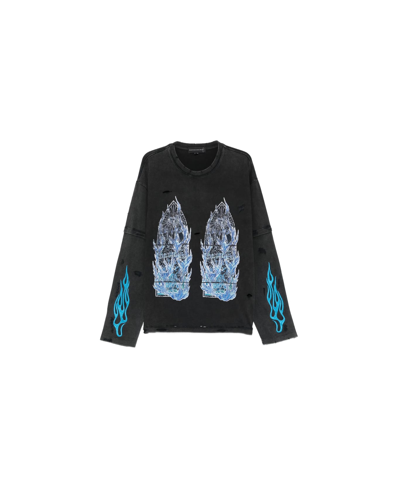 dark grey graphic print flame design round neck long sleeves distressed detail