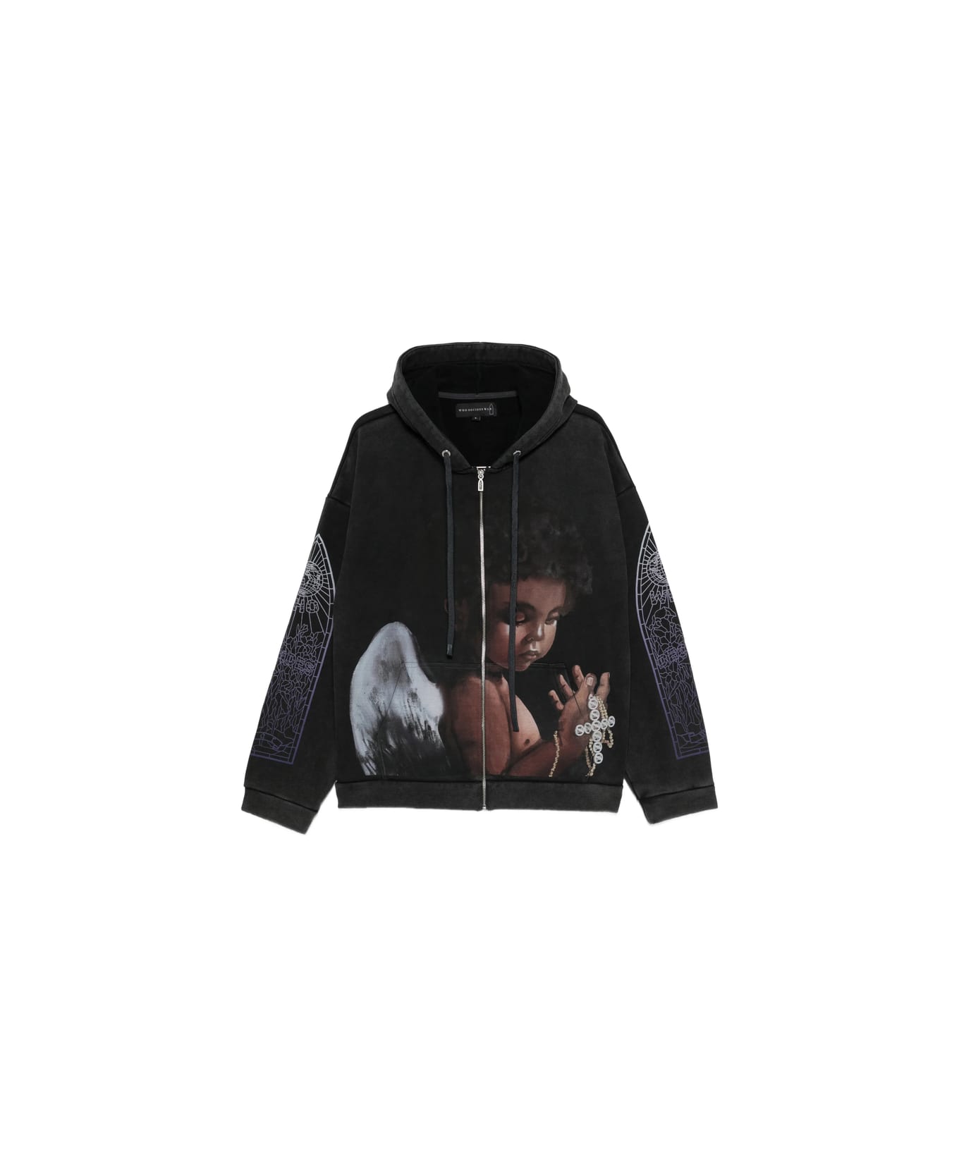 coal grey graphic print front zip fastening hooded long sleeves ribbed hem
