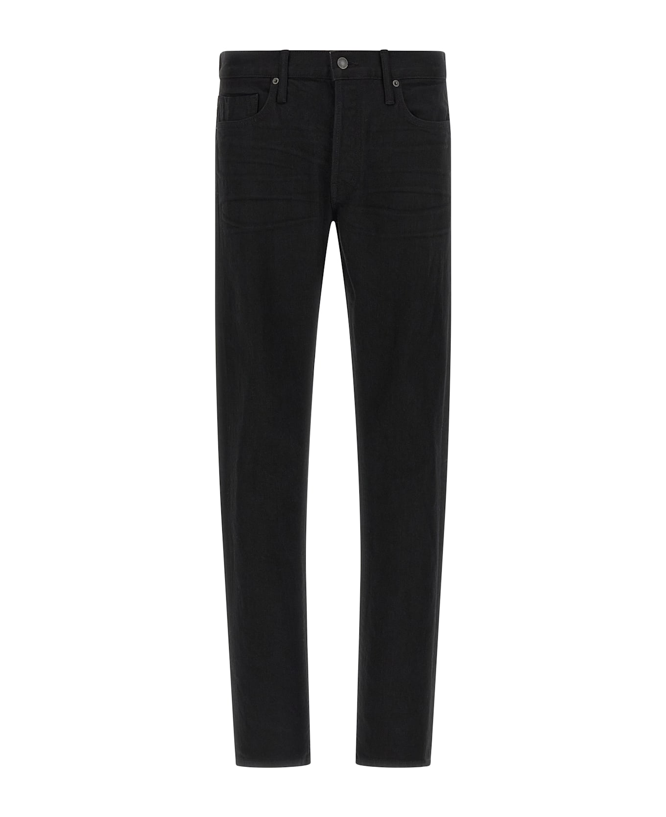 Garment-dyed selvedge stretch denim jeans with straight leg, front button closure, five pockets, tone-on-tone suede logo tag at the back.