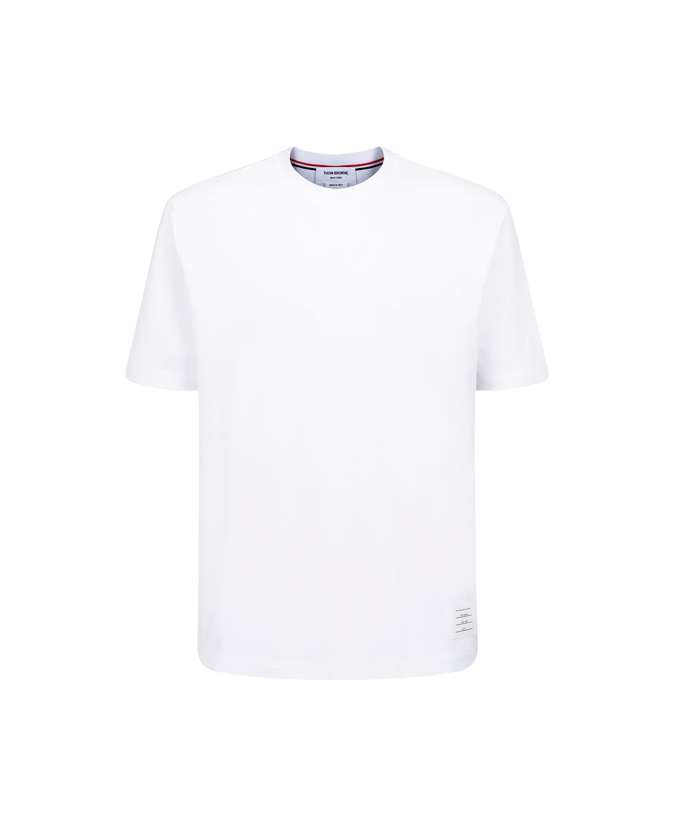The cotton t-shirt by thom browne blends simplicity with sartorial precision. the ribbed crew neck and signature side bands outline a clean silhouette, while the front logo patch and tricolour label on the back express the brand s refined identity. a timeless piece that embodies everyday elegance and meticulous craftsmanship. Composition: 100% % Cotton