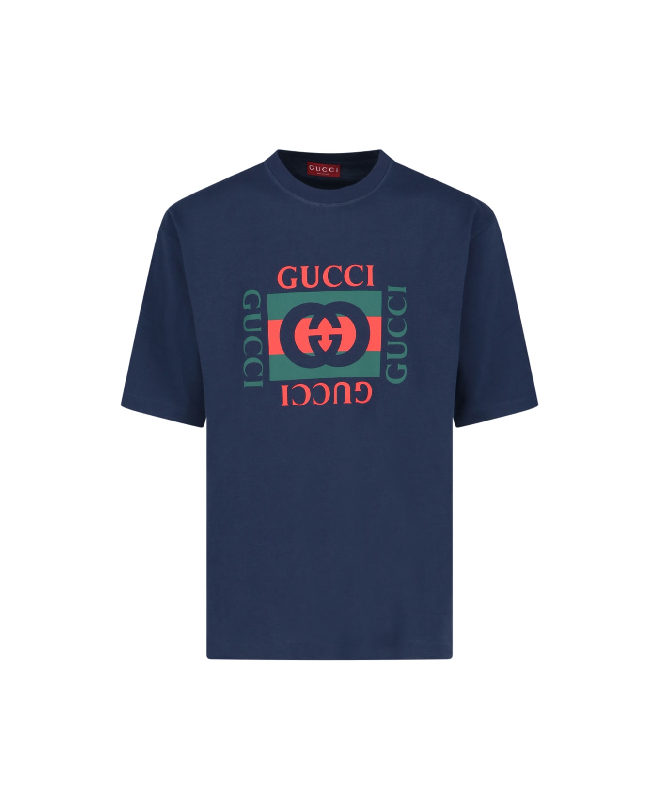 Gucci printed T-shirt in navy blue cotton jersey with red and green details, crew neck, short sleeves, Incrocio GG logo print on the front, ribbed trim, straight hem. Composition: 100% Cotton