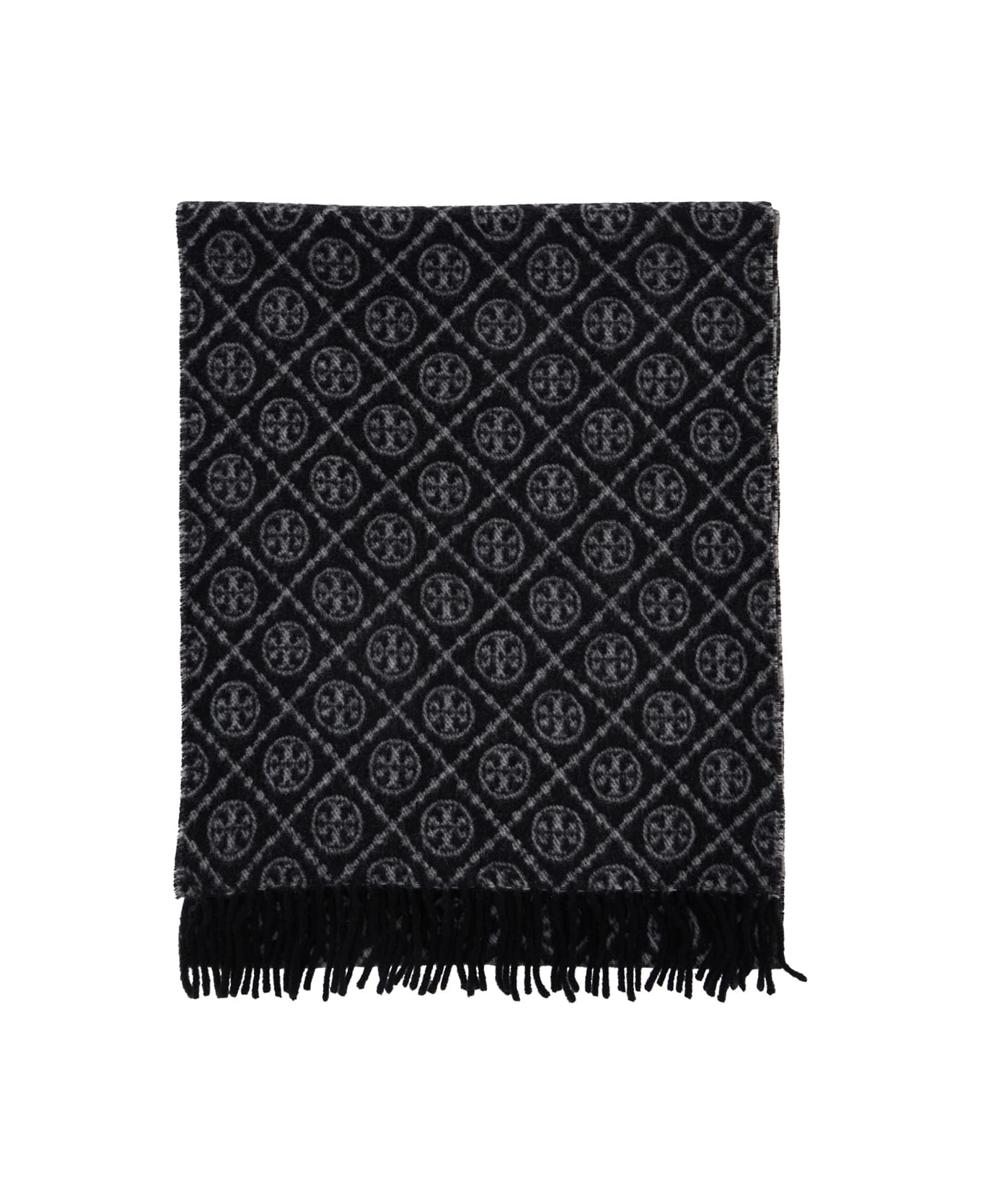 Black Scarf With All-over T Motif Monogram And Fringed Edges In Wool Woman