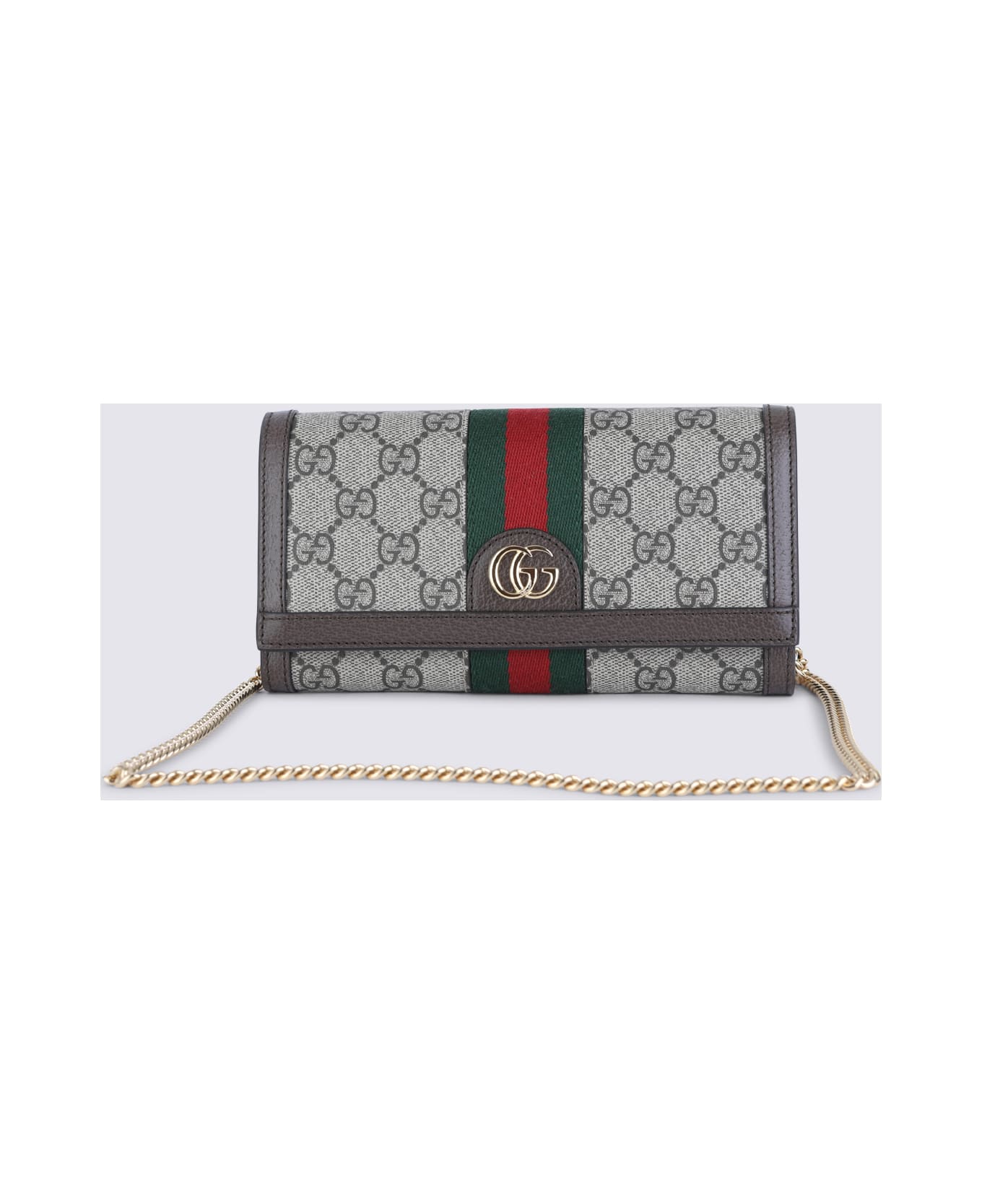 Beige wallet from Gucci featuring gold tone chain strap, main compartment, button fastening, all over monogram and frontal logo.