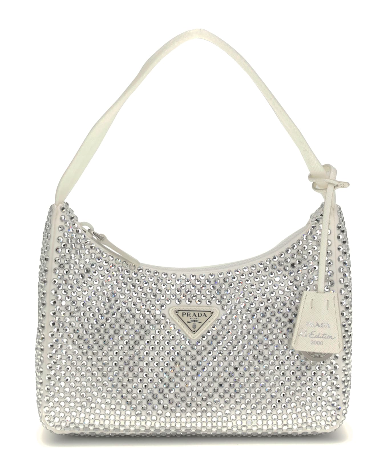 The re-edition shoulder bag by prada is a statement piece that blends glamour and modernity. the silk satin design entirely covered with embossed crystals creates an all-over shimmering effect, while the top zipper closure adds practicality. the brand's iconic signature triangular plaque stands out on the front, accompanied by an adjustable shoulder strap and a key ring attached to its base. Composition: 72% % Viscose, 28% % Silk