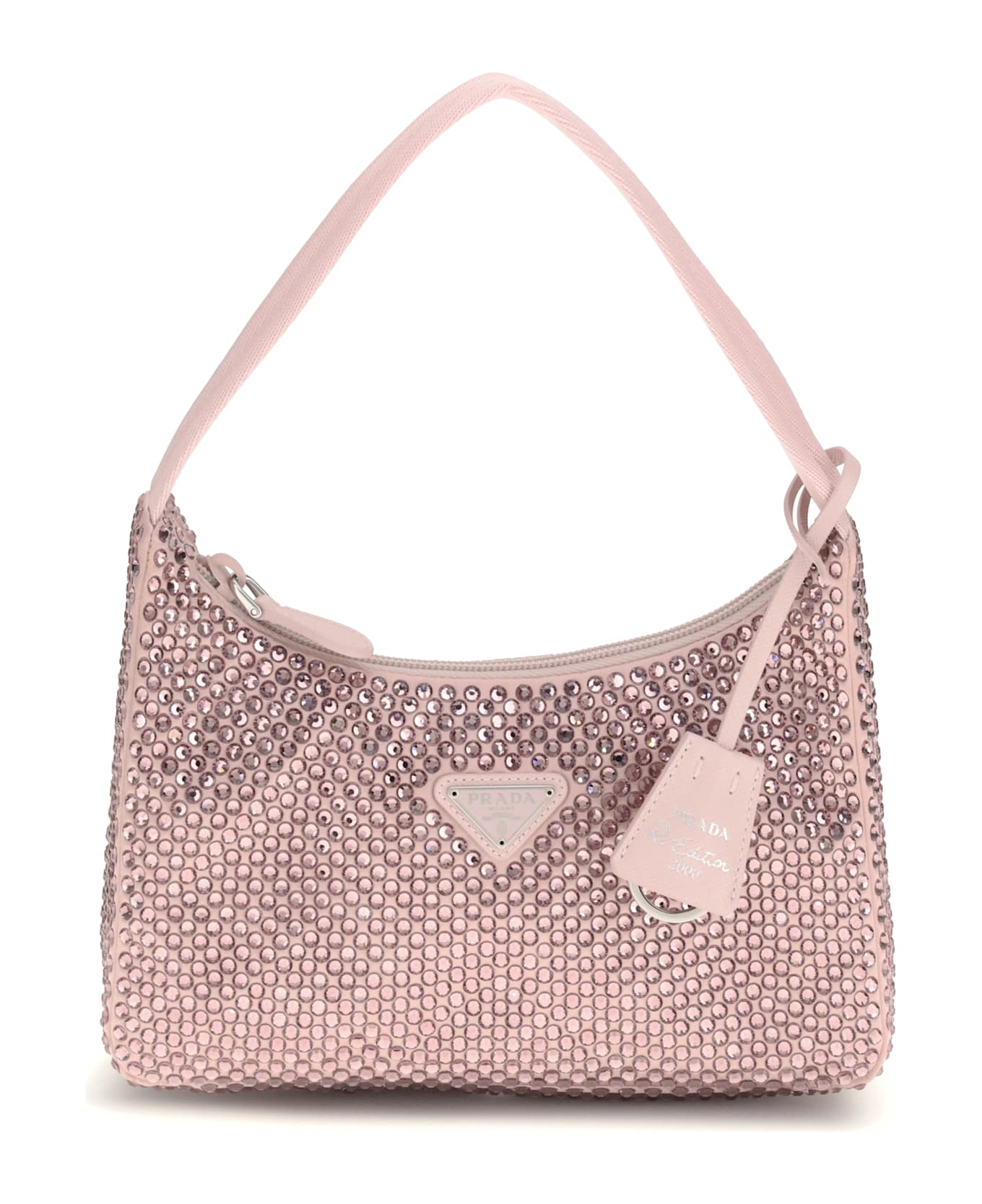 The re-edition shoulder bag by prada is a statement piece that blends glamour and modernity. the silk satin design entirely covered with embossed crystals creates an all-over shimmering effect, while the top zipper closure adds practicality. the brand's iconic signature triangular plaque stands out on the front, accompanied by an adjustable shoulder strap and a key ring attached to its base. Composition: 72% % Viscose, 28% % Silk