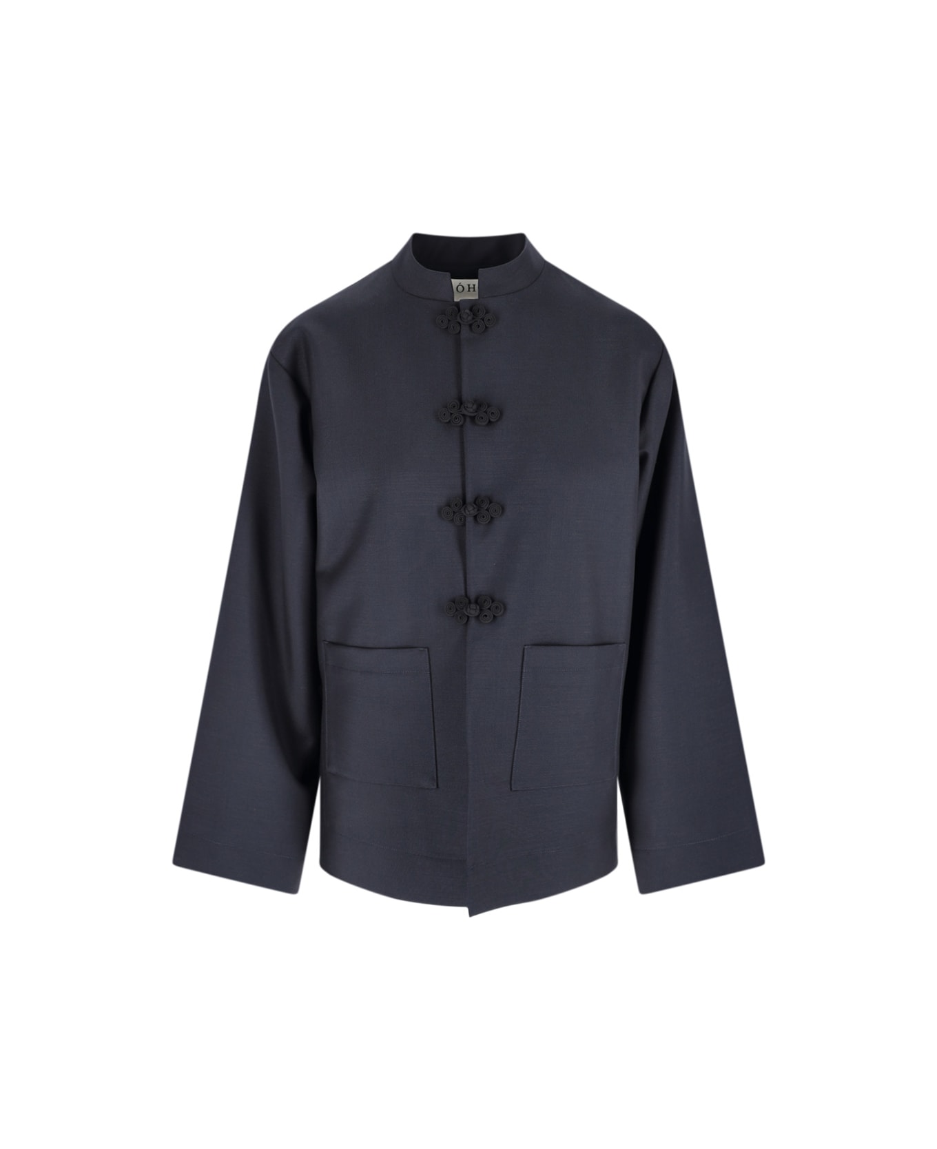 Róhe 'Mandarin' jacket in navy virgin wool and mohair blend with mandarin collar, front toggle closure, long sleeves, two front pockets, and cuvo hem.
