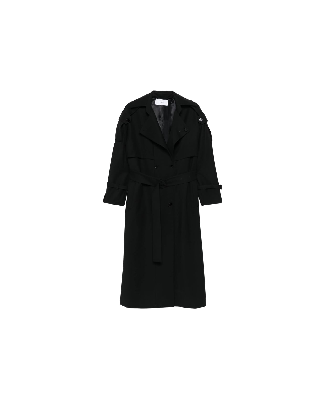 black double-breasted button fastening belted waist epaulettes storm flap