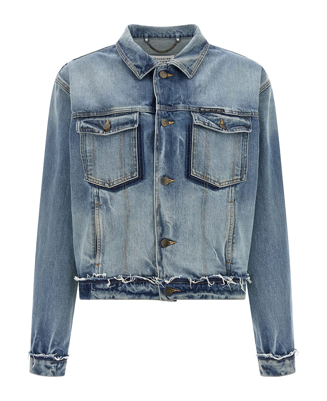 Used-effect washed cotton denim jacket, contrast stitching, frayed hems, shirt collar, front button closure, pockets, long cuffed sleeves, back 'Four Stitches'. Composition: 100% cotton