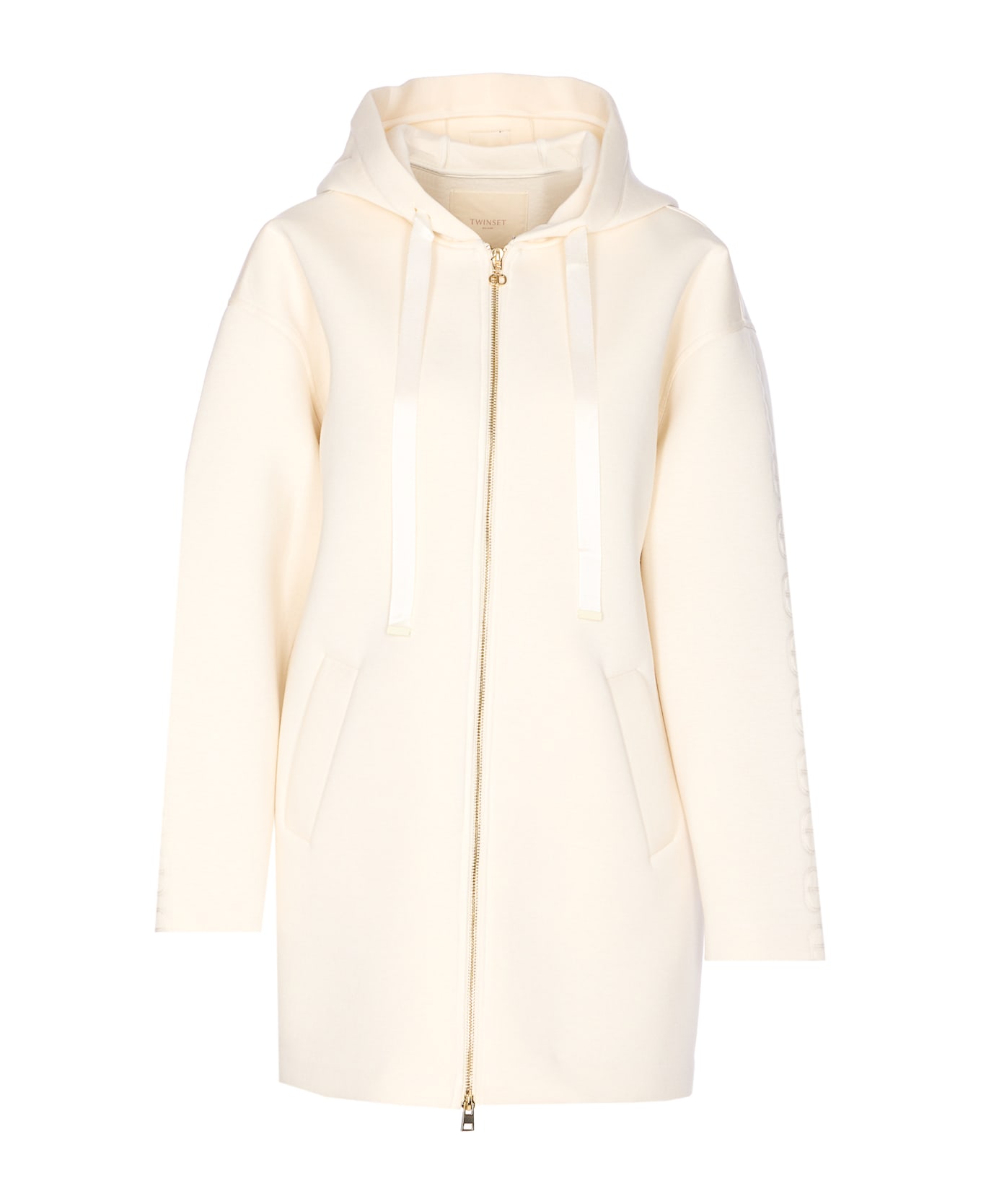 Twinset white jacket with zip closure, hood with coulisse, long sleeves, embroidered logo on sleeves, pockets
