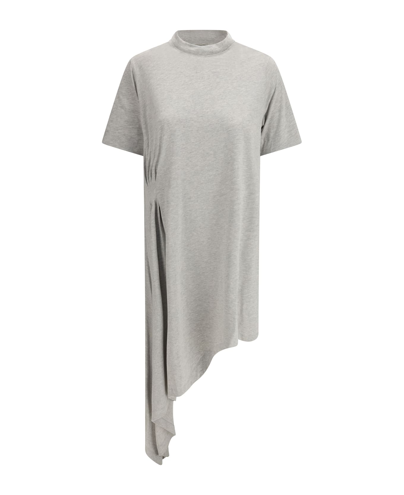 The igari t-shirt dress by loulou de saison, defined by an asymmetrical cut that brings fluidity and a modern edge to the silhouette. a pleated detail adds texture and movement, while the crew neckline and short sleeves echo the simplicity of a classic t-shirt, reimagined with a contemporary twist.