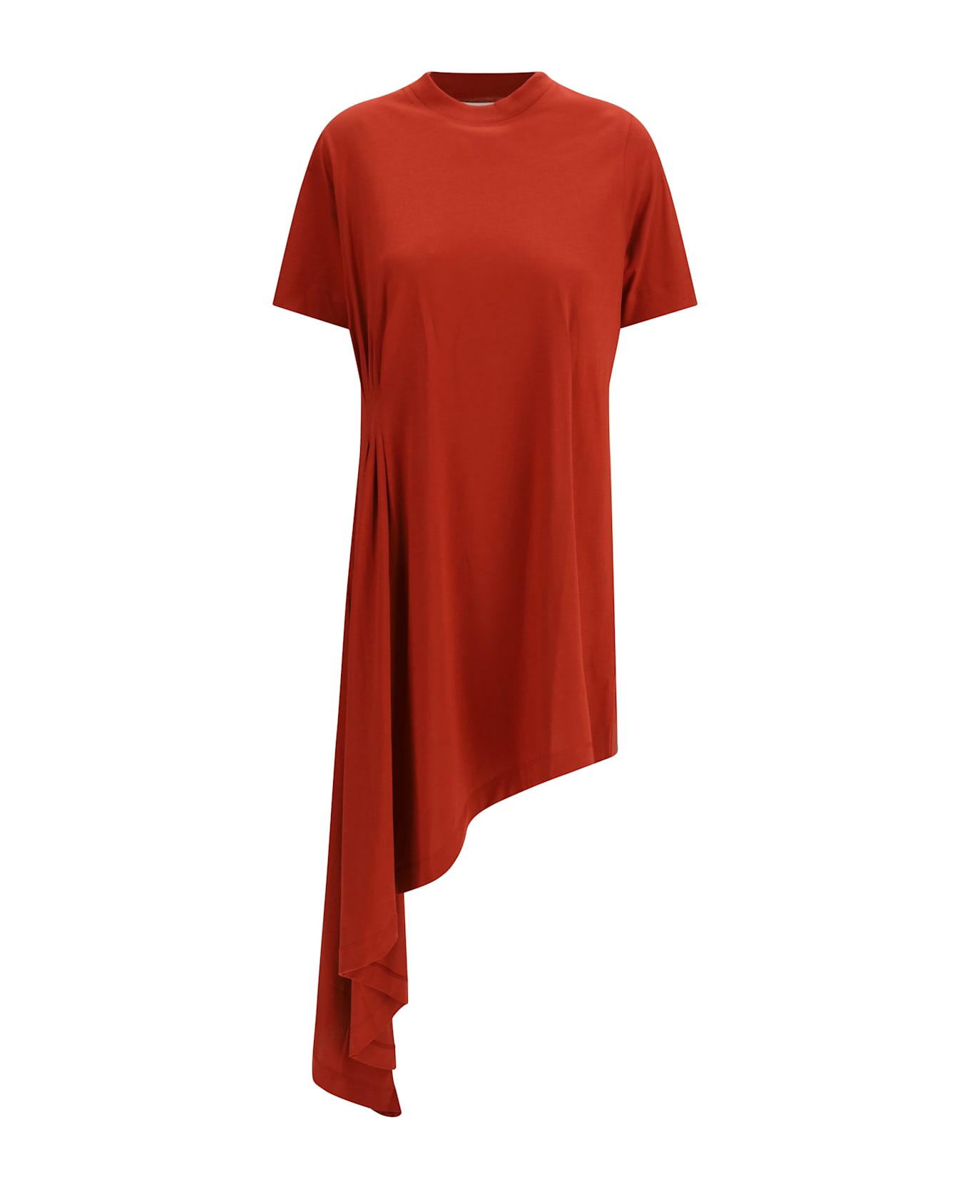 The igari t-shirt dress by loulou de saison, defined by an asymmetrical cut that brings fluidity and a modern edge to the silhouette. a pleated detail adds texture and movement, while the crew neckline and short sleeves echo the simplicity of a classic t-shirt, reimagined with a contemporary twist.