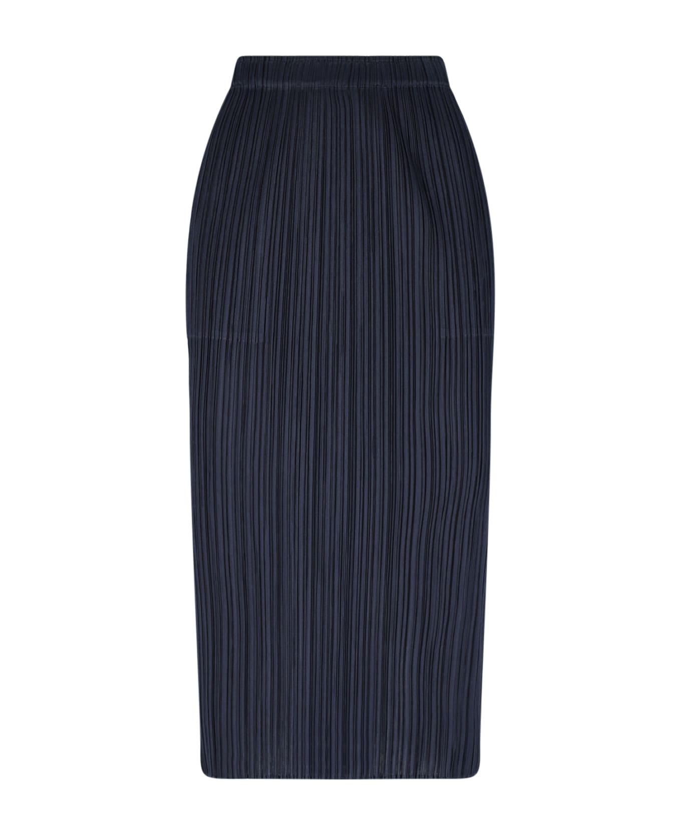 Pleats Please pleated midi skirt in navy blue fabric with two side pockets, and straight hem.