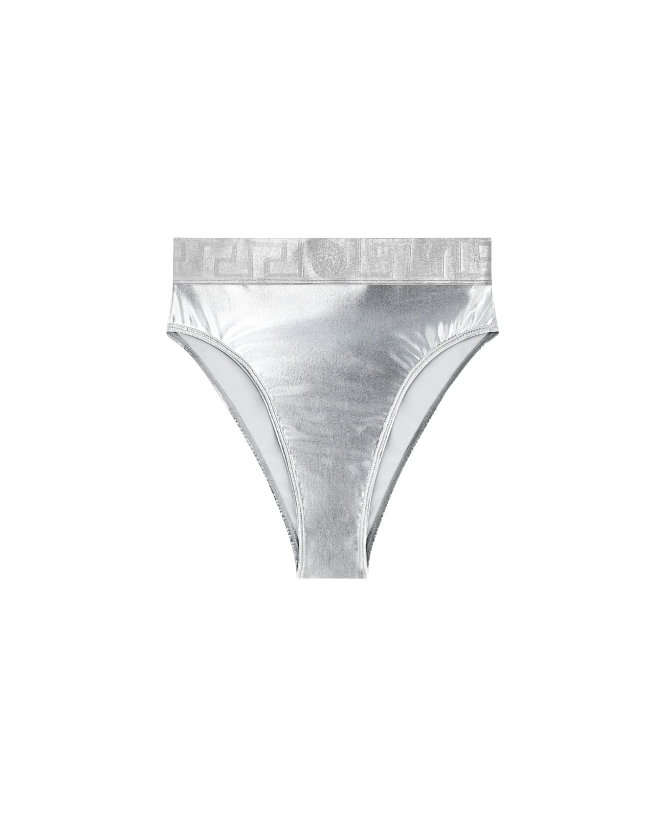 silver metallic finish elastic waistband Be mindful to try on swimwear over your own garments.