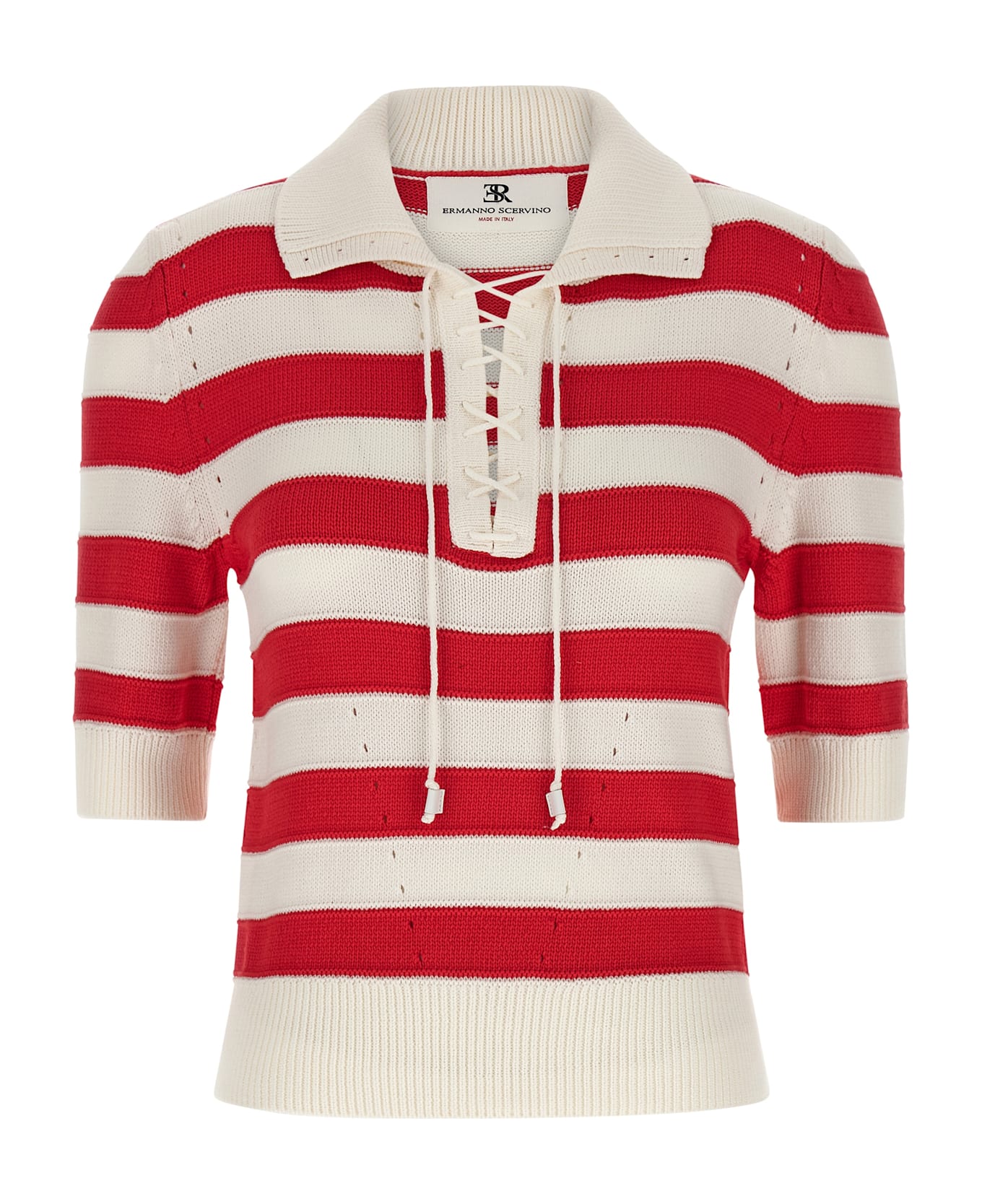 Crochet cotton blend polo shirt, collar with front drawstring closure, and short sleeves.
