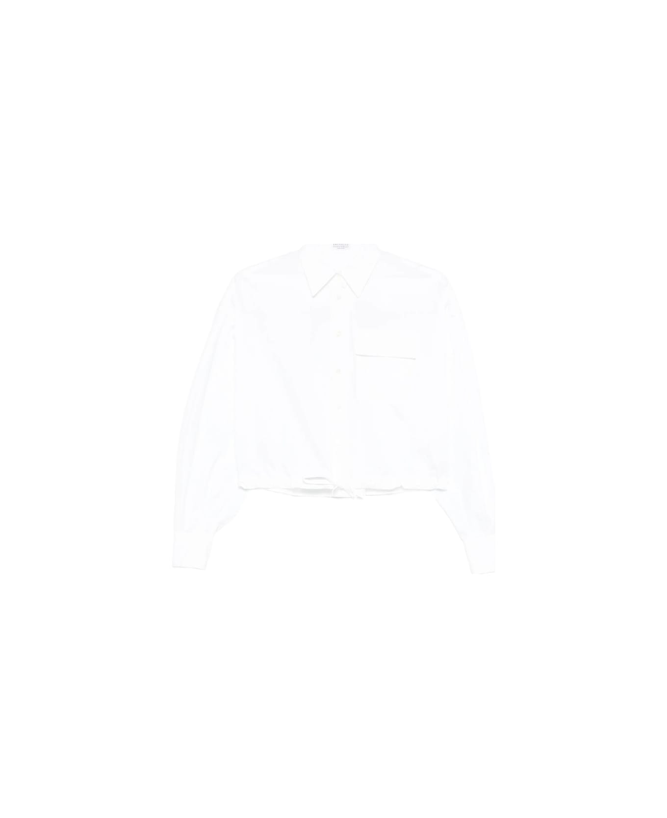 white chest pocket drawstring hem button fastening long sleeves buttoned cuffs