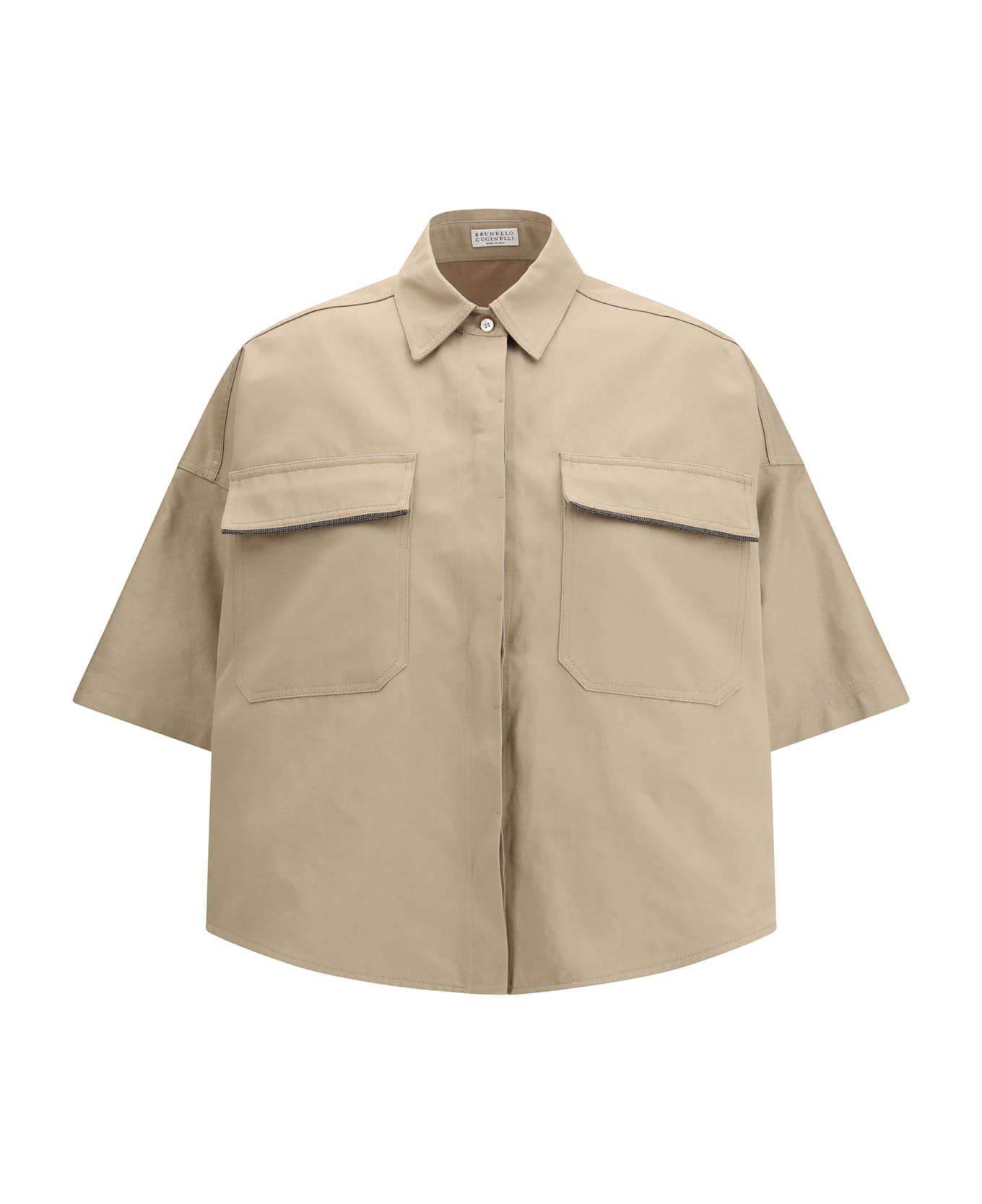 The short-sleeve shirt by brunello cucinelli is crafted from a refined blend of linen and cotton, offering a naturally lightweight and breathable feel. its clean, timeless design is defined by a classic collar, a button-down front, and two front patch pockets placed symmetrically for a balanced, utilitarian touch. the relaxed silhouette enhances its effortless elegance, making it a versatile piece for refined everyday dressing.
