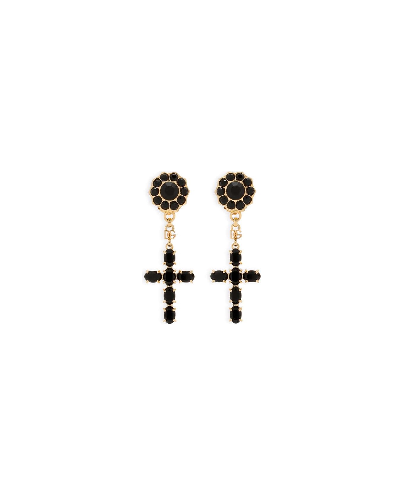 gold-tone polished finish dangle design cross pendant rhinestone embellishment clip-on design These earrings come as a pair.
