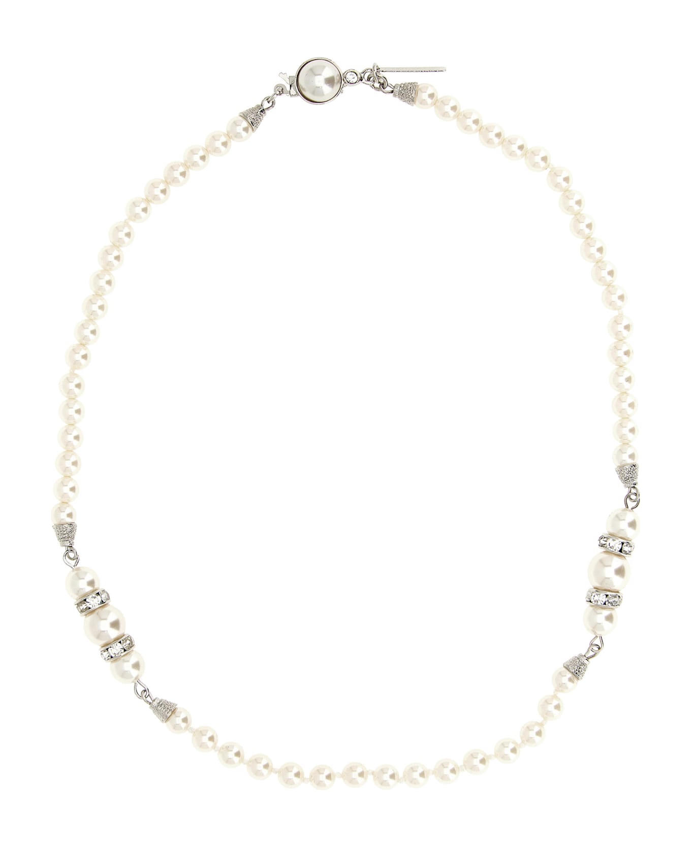 Pearl necklace with crystal decorations, interlocking hook closure.