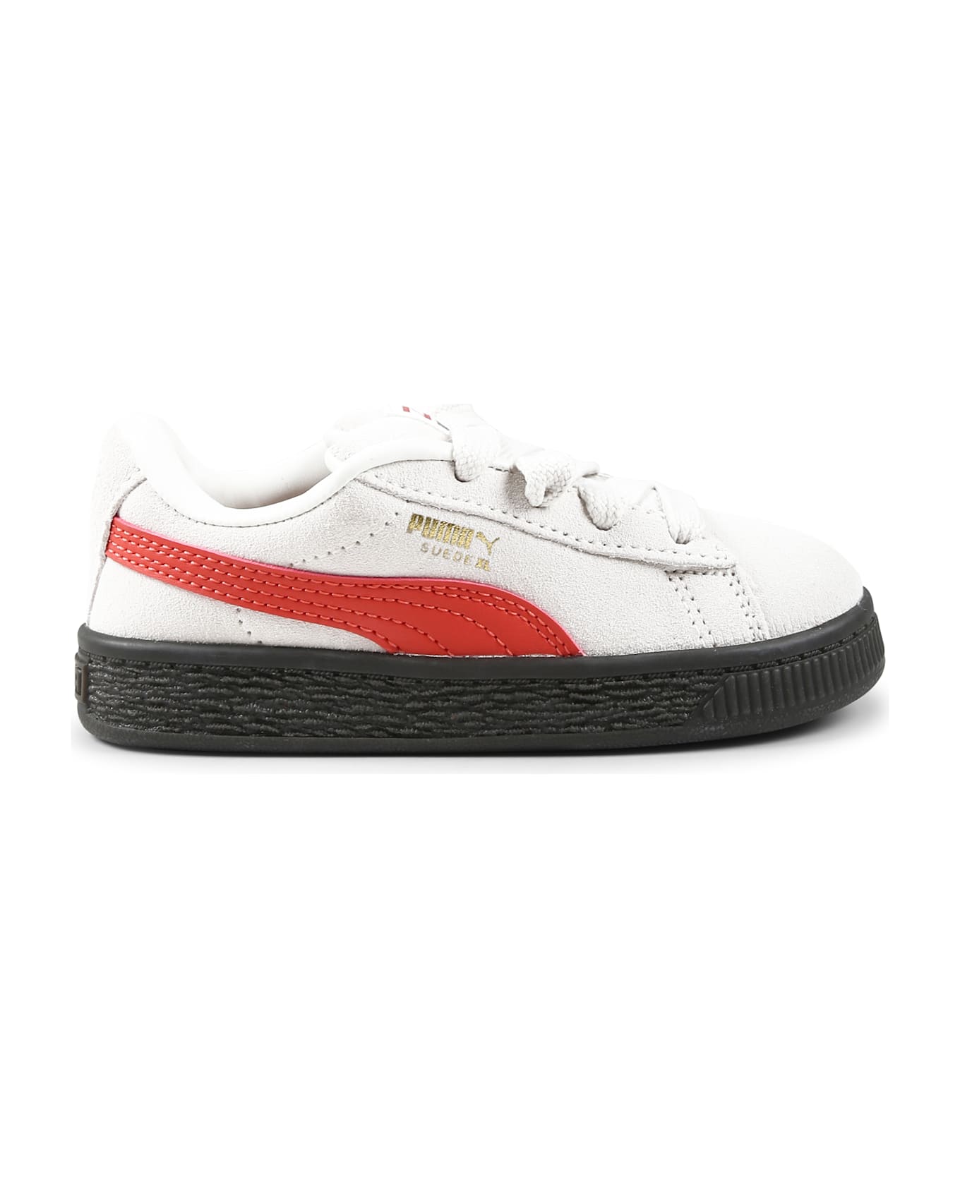Grey suede sneakers, with brown rubber sole, double laces, round toe and red details on the sides. They are embellished with a gold side logo.