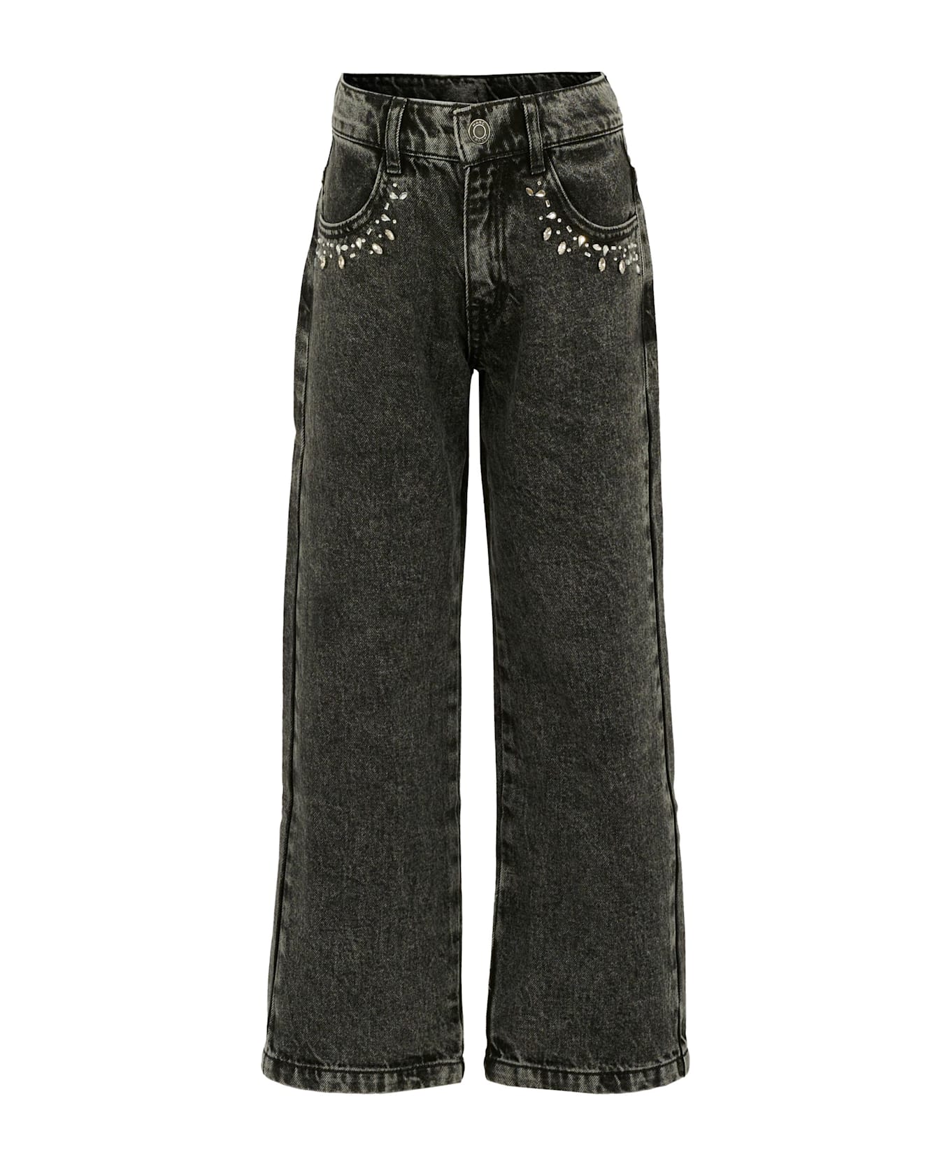 Black jeans with belt loops, a front zip and snap button closure, side pockets, and back pockets; an adjustable waistband with an internal buttoned elastic band. They are embellished with stones on the front and a rubber logo patch on the back.