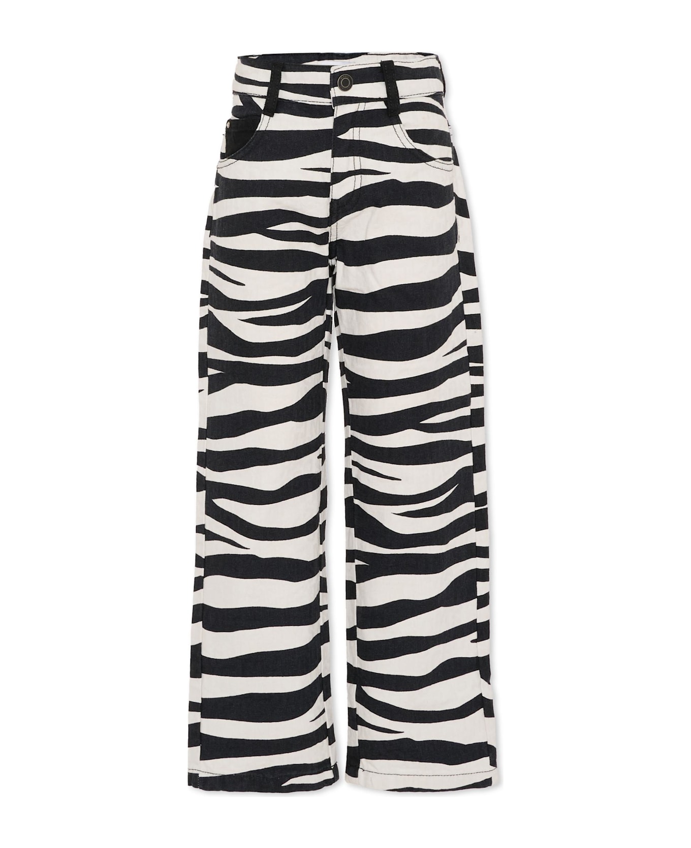 Black five-pocket trousers with a front zip and snap button fastening and an adjustable waistband with an internal buttoned elastic. They are embellished with a zebra print and all-over jacquard logo and a rubberized logo on the back.