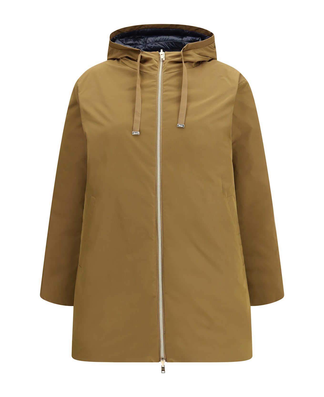 The double-face down jacket by herno delivers a contemporary and functional elegance. designed with a midi length, it features a quilted hood finished with contrast-color drawstrings, adding a subtle graphic accent to the design. two welt pockets complete the clean, streamlined silhouette, making this piece a refined and versatile outerwear option for colder seasons.