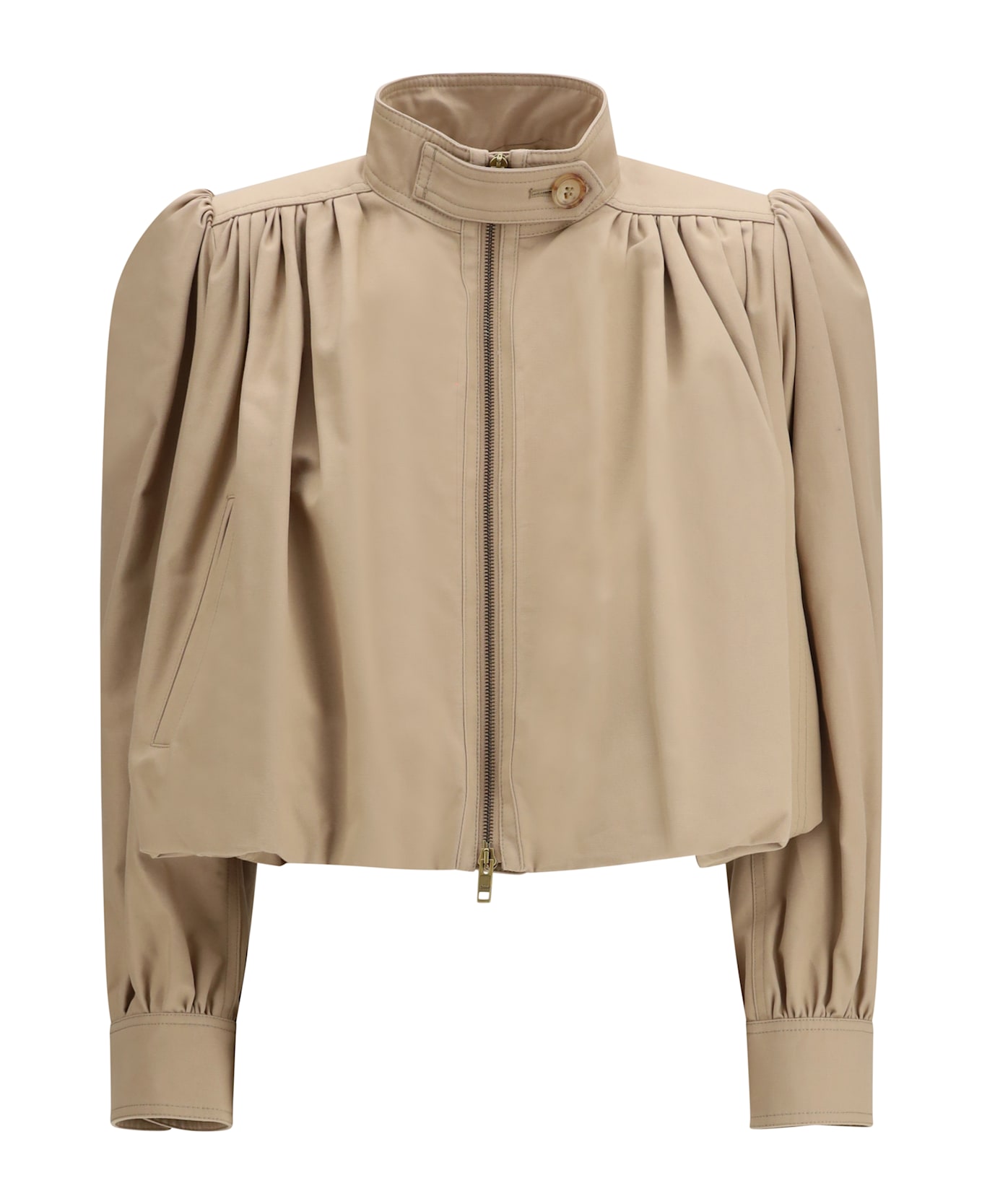 The boule gathered jacket by chloé delivers a feminine, contemporary aesthetic. crafted from pure cotton in a brown hue, it features a cropped silhouette enhanced by gathered shoulders that add volume and character. the design is defined by a high collar and a front zip closure, complemented by engraved horn buttons as a refined detail. front slit pockets and buttoned cuffs add functionality, while the lined interior ensures comfort and a polished fit.