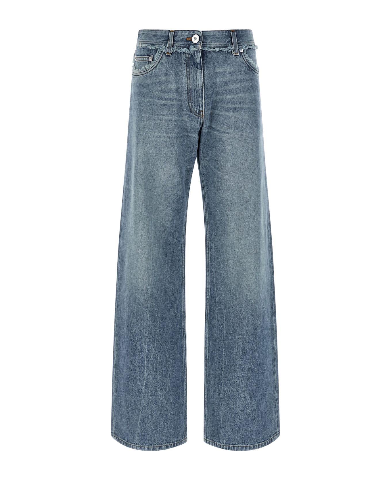 Boyfriend jeans in stonewashed cotton denim with frayed edges, contrasting stitching, low waist, wide leg, five pockets, front zip and button closure, leather tab at back. Composition: 100% cotton