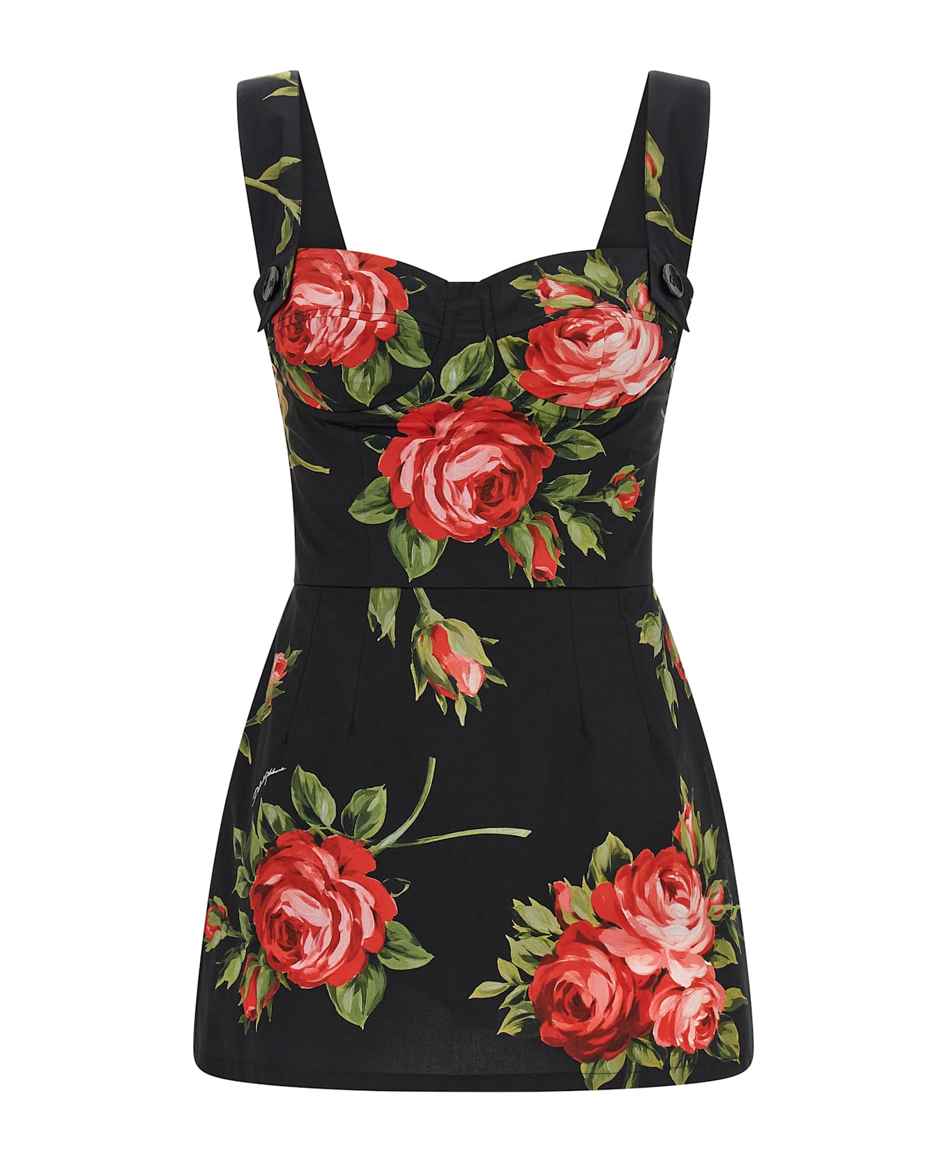 All-over 'Bouquet Rose' print cotton top, bodice with lined corset and underwire cup, side splints, wide shoulder strap, back zip closure, side slits on the hem, high-waisted culottes with elastic on the inner hem. The differences in print placement you might find on this product is a characteristic of Dolce&Gabbana's Handmade products. A peculiarity that makes each garment or accessory unique and exclusive.