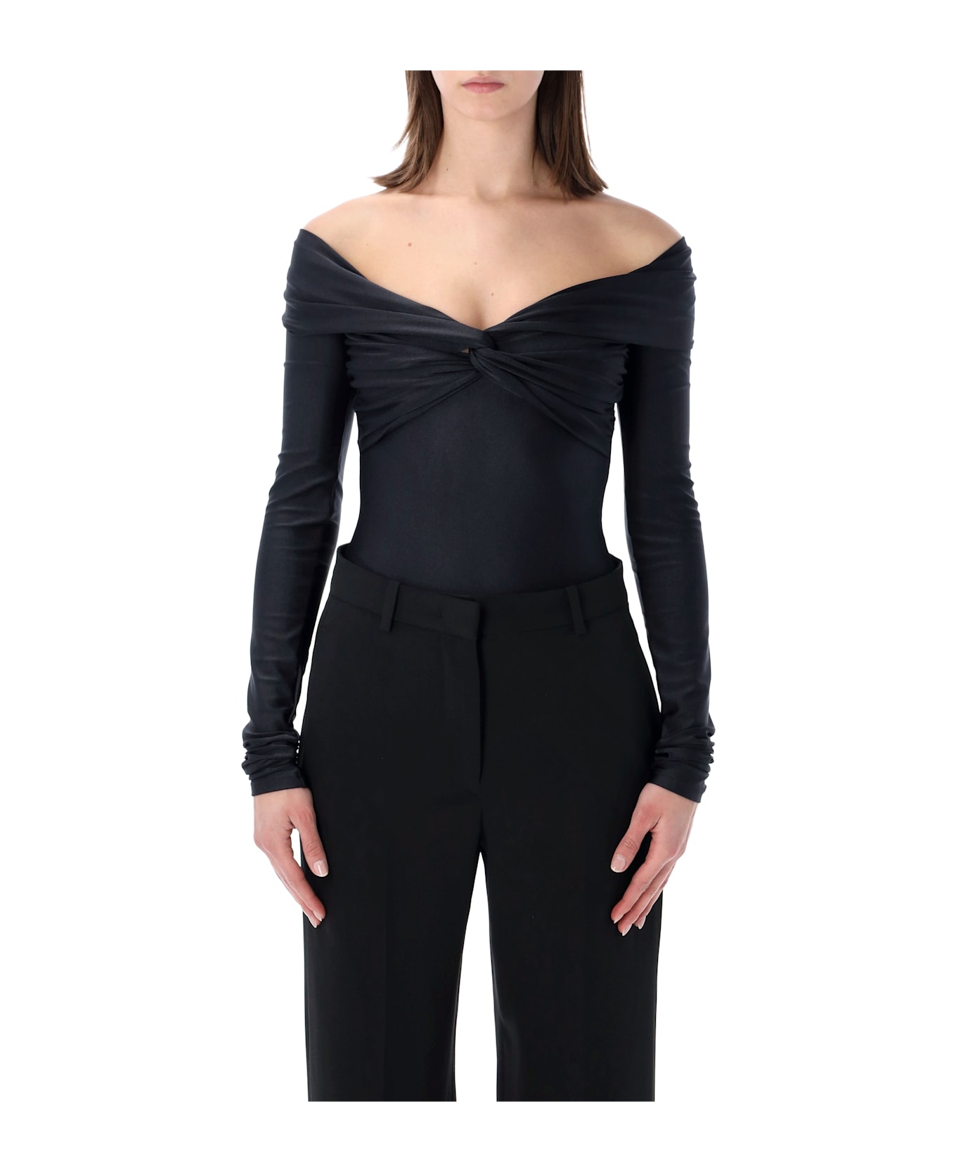 This Stretch Bodysuit By The Andamane Features An Elegant Off-shoulder Neckline With A Draped Knot That Shapes The Bust. Designed For A Smooth, Sculpted Fit, It Offers A Refined Silhouette Enhanced By Long Fitted Sleeves. The Snap Closure Ensures Practicality While Maintaining A Sleek, Seamless Look. Off-shoulder Neckline Draped Knot Detail Slim, Fitted Silhouette Long Sleeves Snap Fastening At Crotch Soft Stretch Construction Model Is 1,70 M And Wears Size S