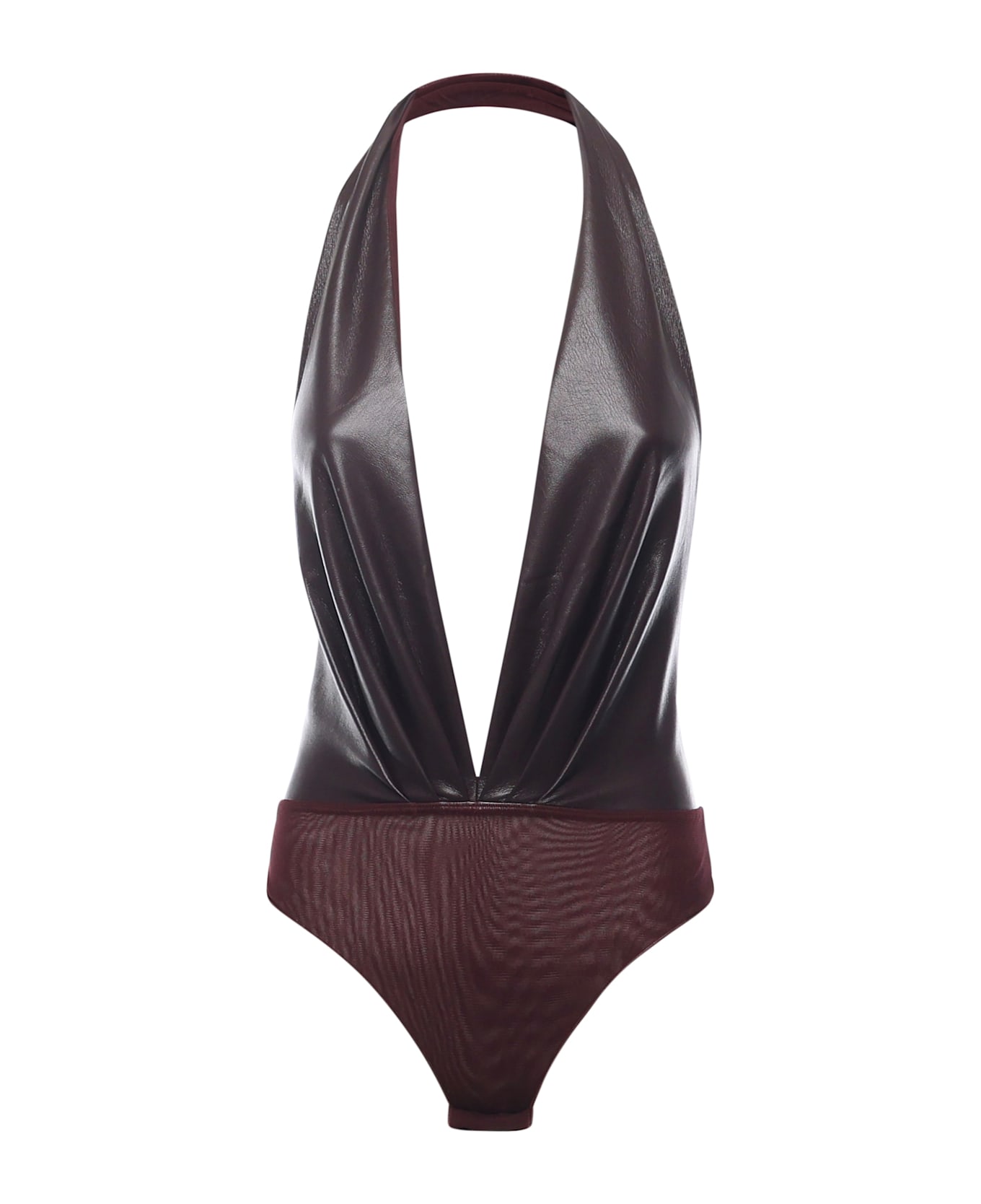 - Made of vegan leather - Deep V-neck - Sleeveless - Size shown in photo is XS - Made in Italy - Designer color: Cabernet