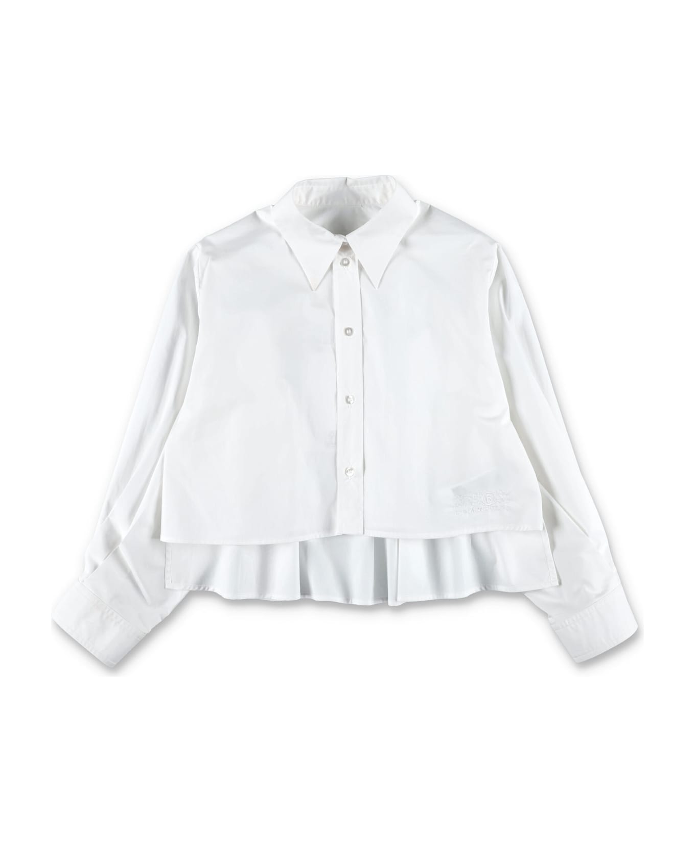 White Cotton Cropped Shirt By Mm6 Maison Margiela Features, Long Sleeves, And A Classic Pointed Collar, Front Button Closure, Pleated Back Detailing, And Tonal Embroidered Numeric Logo Near The Hem. Classic Pointed Collar