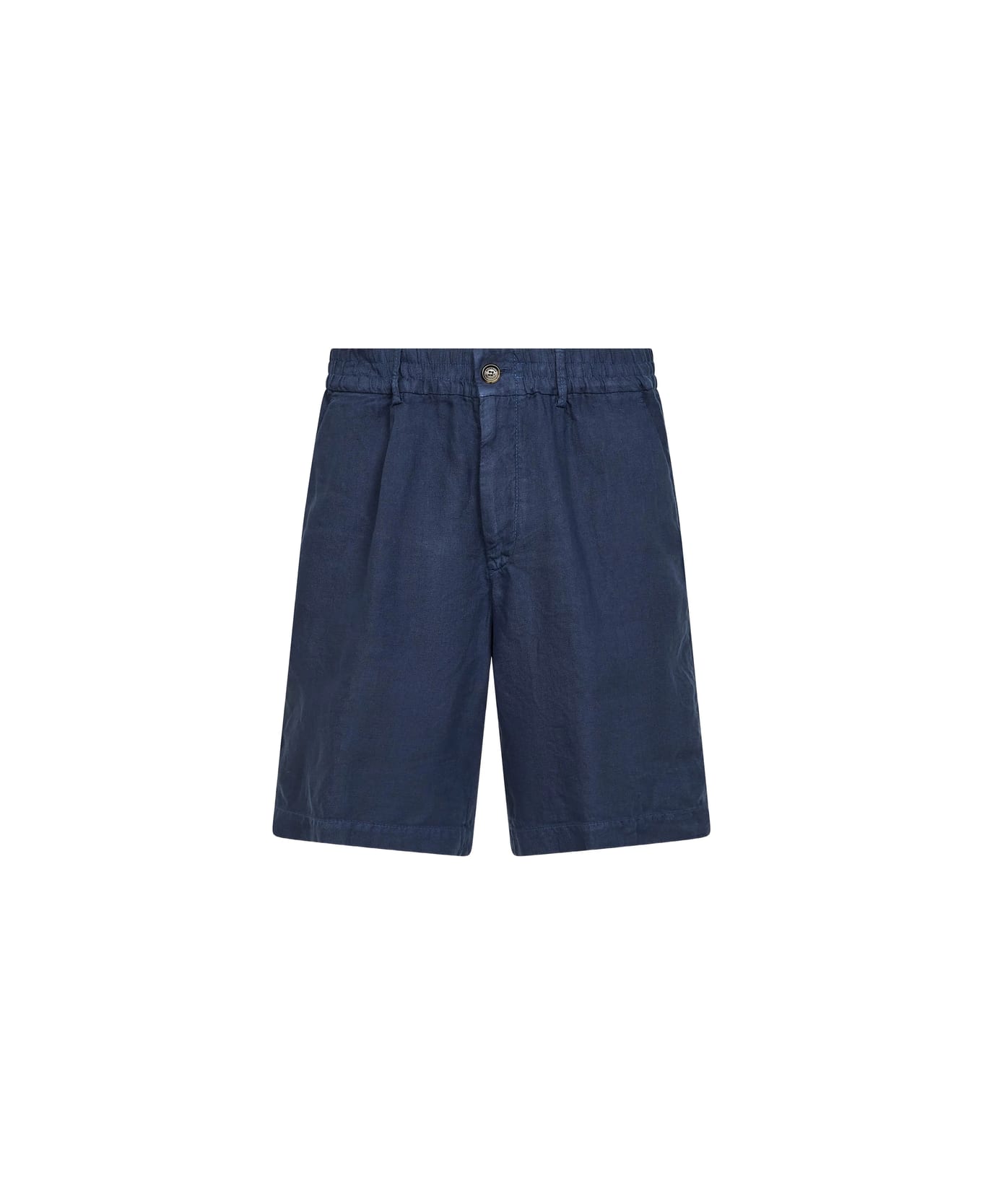 blue elasticated waistband belt-loops pleat back flap-pockets buttoned pockets