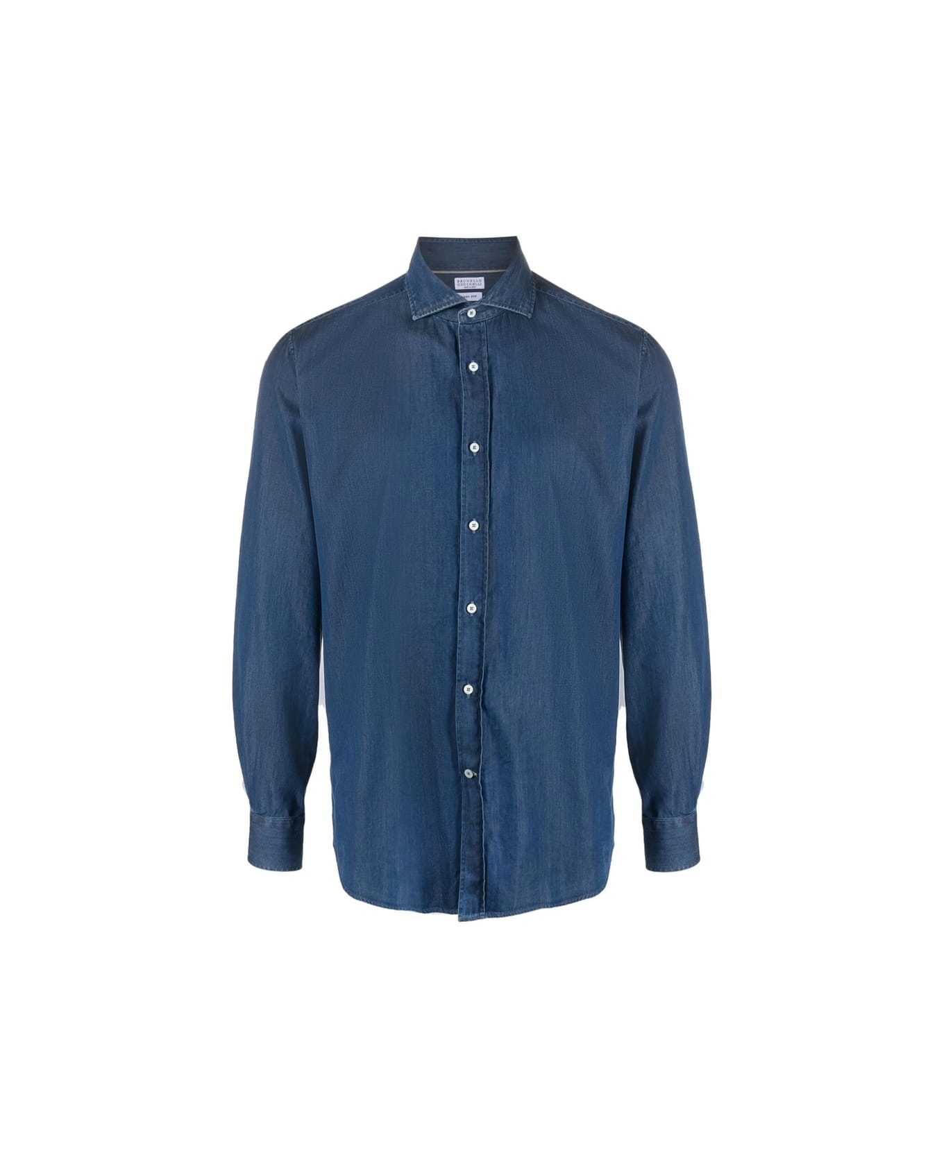 blue cotton front button fastening classic collar long sleeves buttoned cuffs curved hem