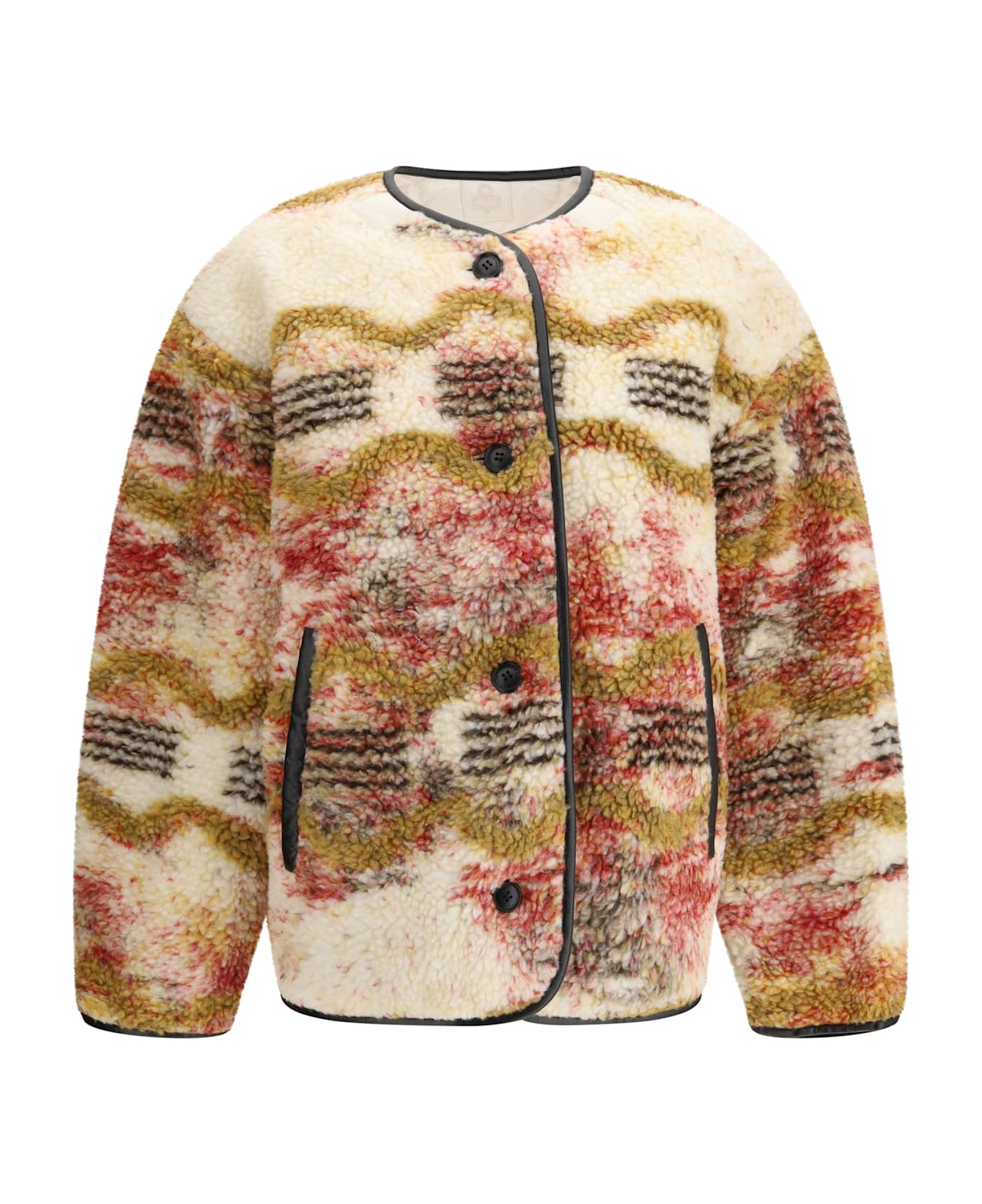 The reversible jacket by marant etoile blends functionality and style in a versatile, contemporary design. the round neckline and long sleeves with a classic armhole create a clean, understated silhouette, while the front closure with contrasting round buttons adds a distinctive graphic detail. side patch and welt pockets provide practicality with a refined touch. the jacket reveals a more casual attitude on its reversible side in fleece, featuring a cloud print that adds a playful and original finish.