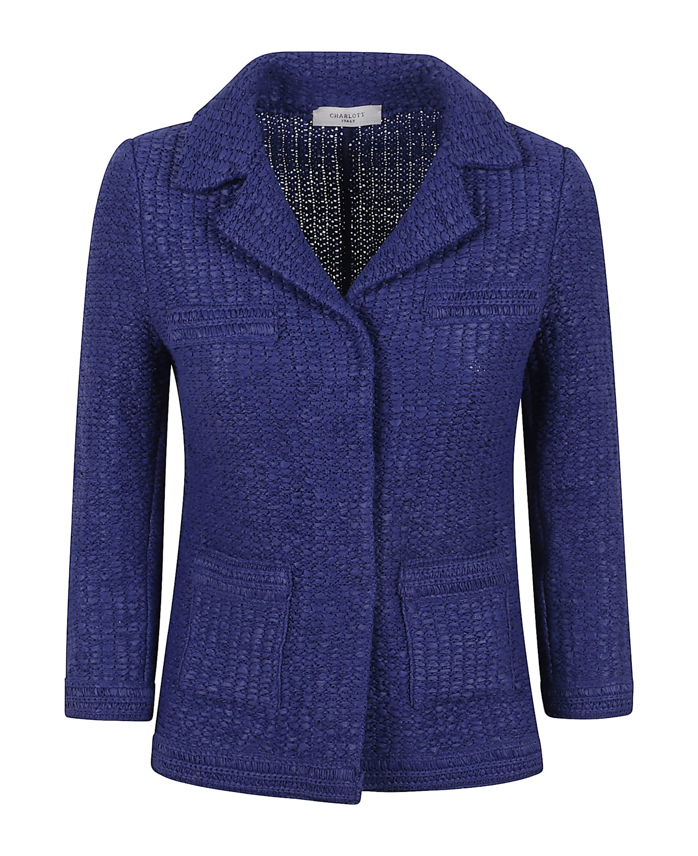 Short, waisted and fitted, very light handcrafted knitted jacket with patch pockets and press studs