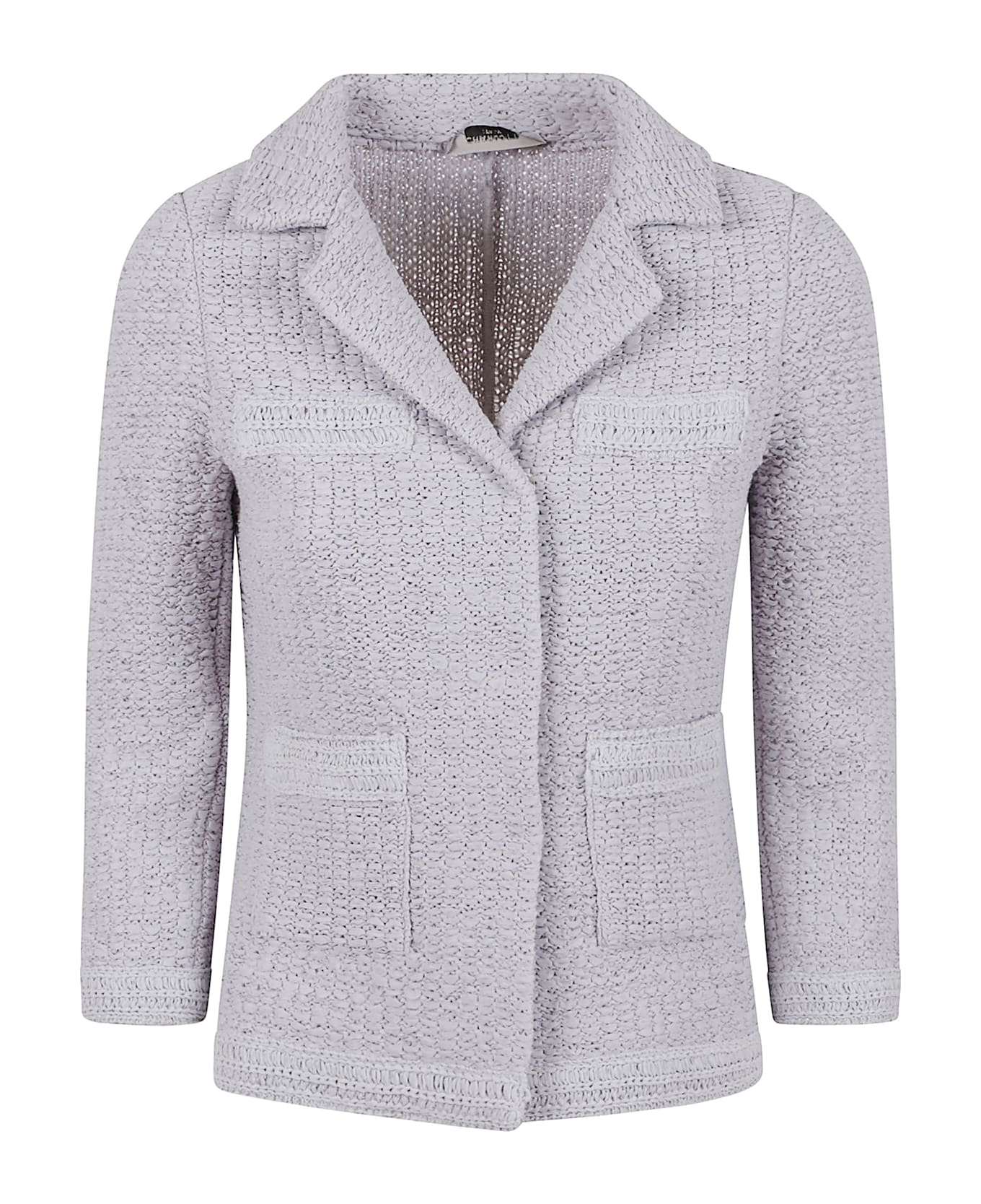 Short, waisted and fitted, very light handcrafted knitted jacket with patch pockets and press studs