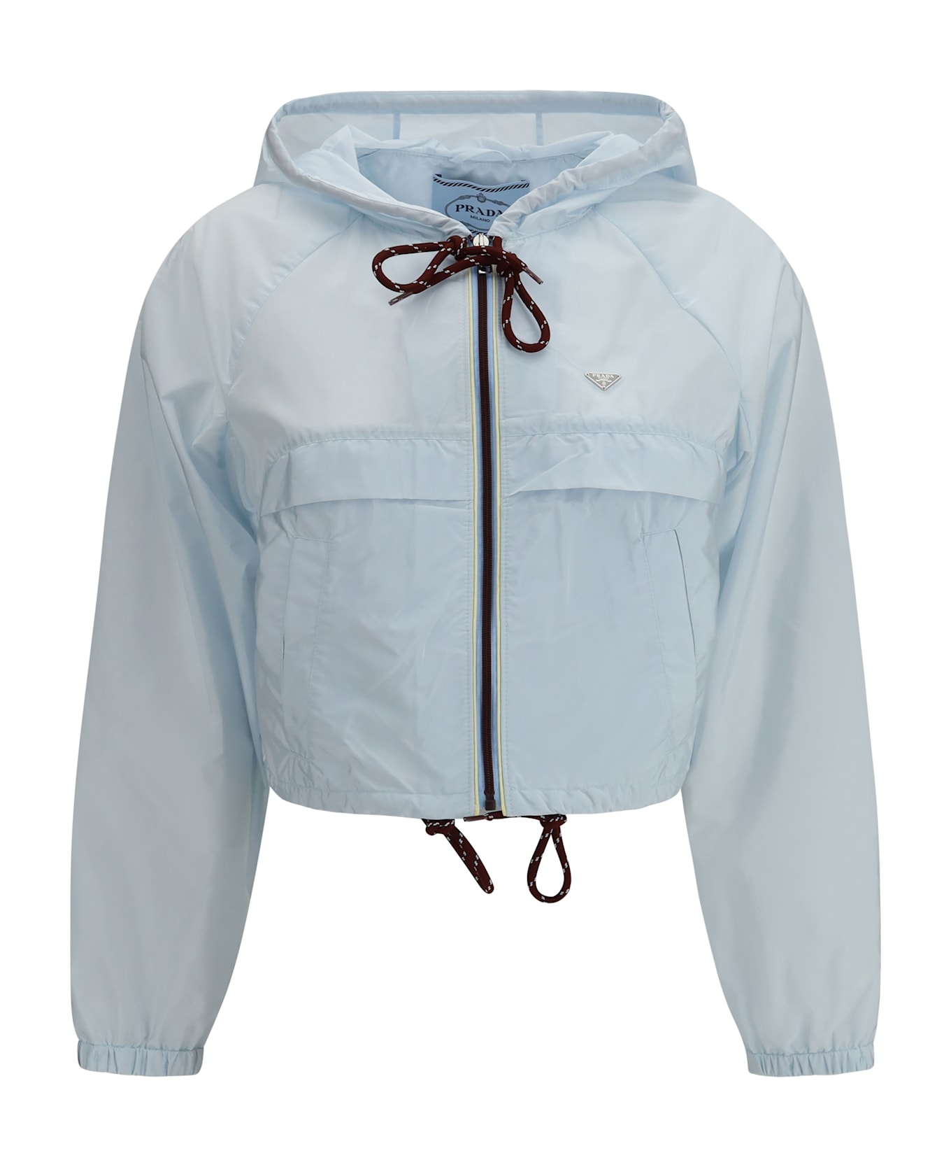 The re-nylon windbreaker by prada is a versatile and functional garment made from re-nylon, a high-quality sustainable material. with a cropped fit, it is embellished with the distinctive metal logo triangle on the chest. the drawstring hood and zip closure ensure practicality, while the two flap pockets and two slit pockets on the front offer extra storage space. the elasticated gathered cuffs and drawstring hem complete the design, ensuring comfort and an adjustable fit. Composition: 100% % Recycled Polyamide
