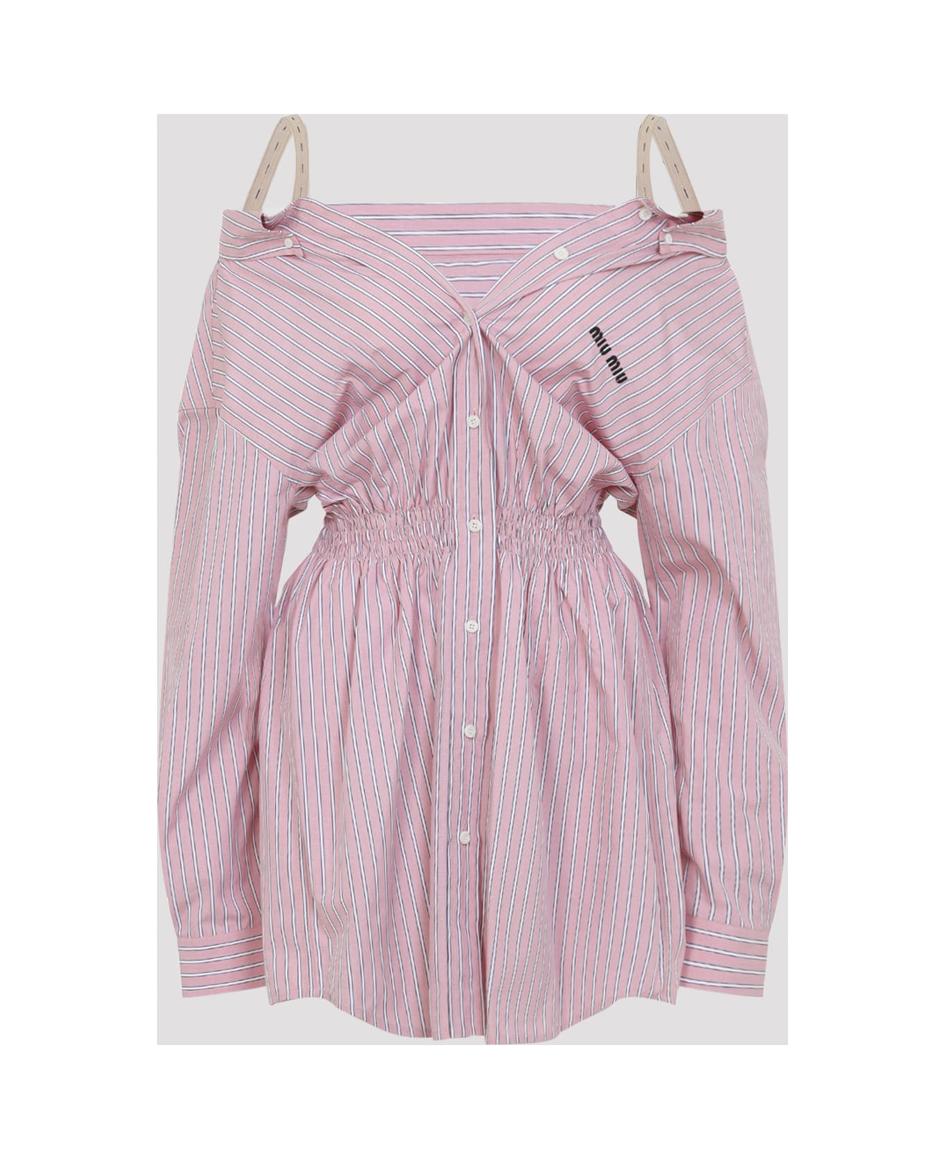 Miu Miu Pink Cotton Dress. Pure cotton dress, off-shoulders, thin adjustable shoulder strap, chest contrasting black embroidered logo, front buttoned fastening, elastic waist, long sleeves, buttoned cuffs, mini-length, asymmetric hem. Shirt design. Pink, blue and white stripes pattern all-over.