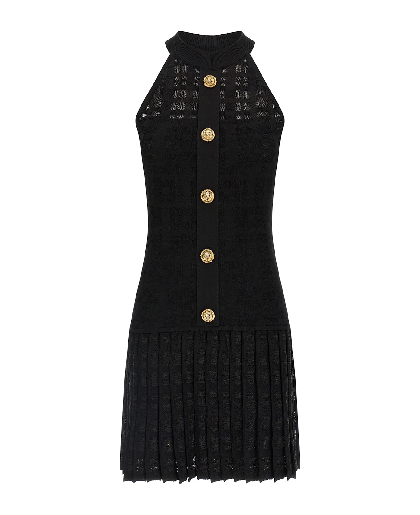 I don't see tartan knit mini dress, front metal 'Testa di leone' buttons, high neck, tank top top, sleeveless, back zip closure, pleated skirt.