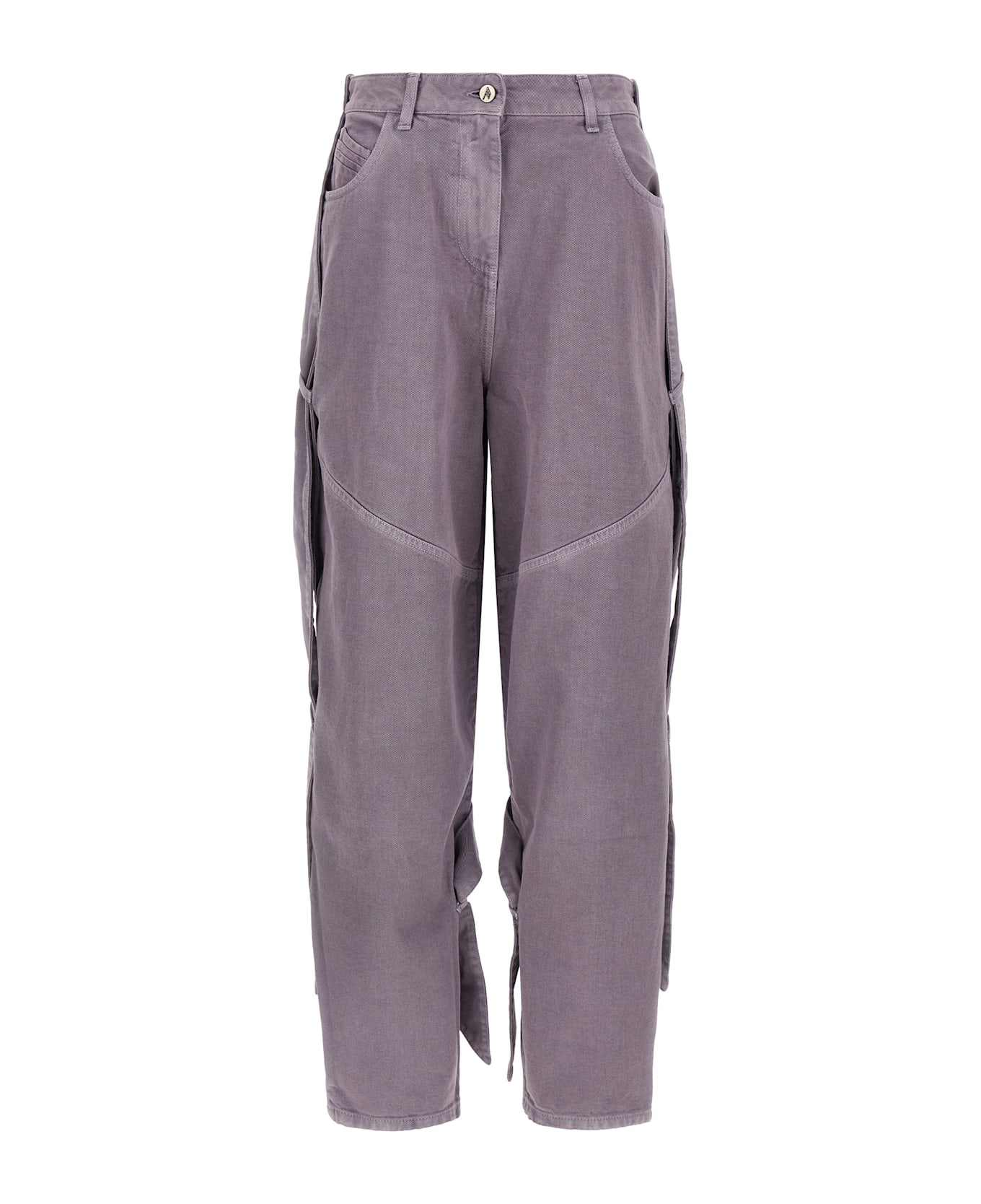Garment-dyed cotton denim jeans, wide tapered leg, low crotch, front zip and button closure, five pockets, matching side ribbons to modulate as desired, back leather logo tag. Composition: 100% cotton