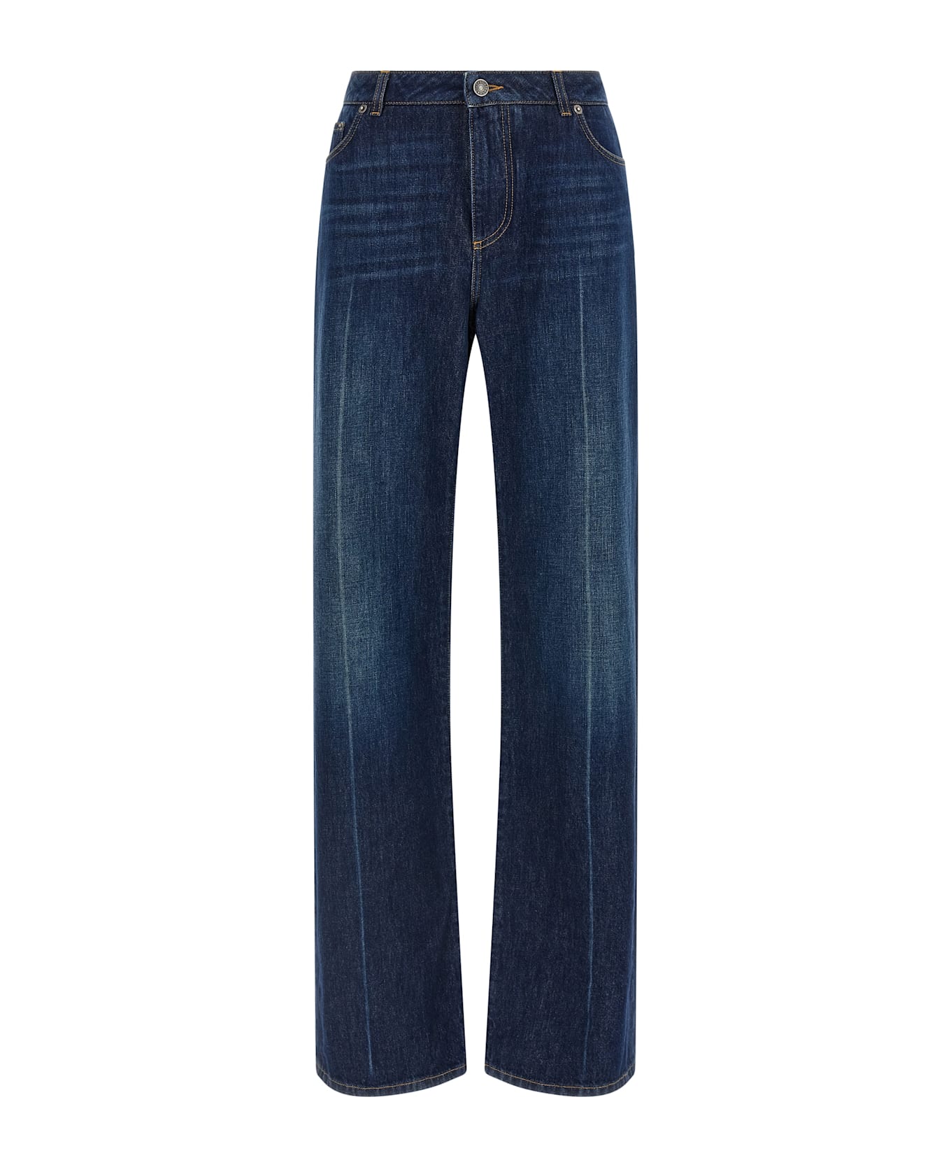 Stone-washed cotton denim jeans with contrast stitching, low waist, stretched trompe l'oeil pleat, straight leg, front zip and button closure, five pockets, leather logo tag and galvanic tag with engraved logo on the back. Composition: 100% cotton
