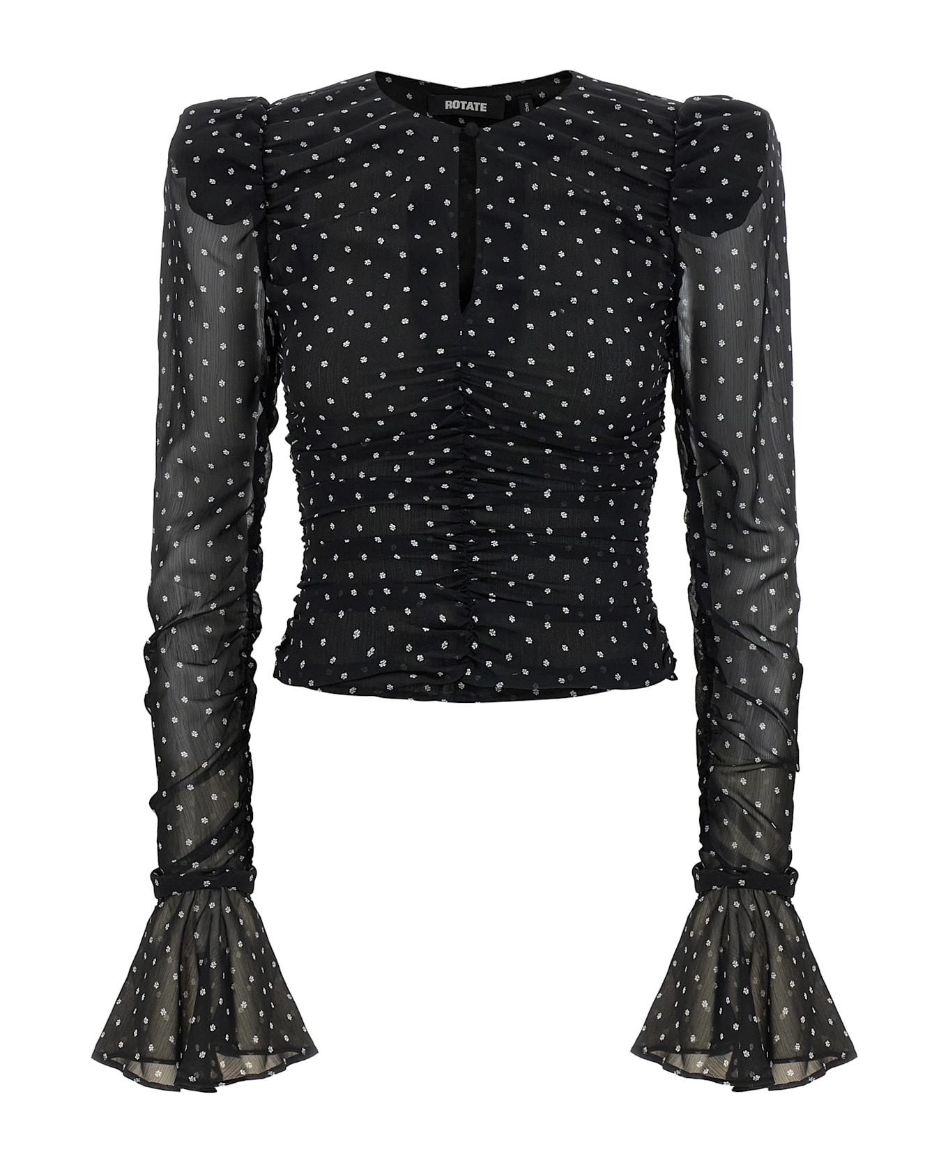 'Chiffon Ruched' blouse in semi-transparent silk-effect fabric with floral microprint, crew neck, front and back curl, back zip, long sleeves with flounces on the cuffs. Composition: 100% polyester