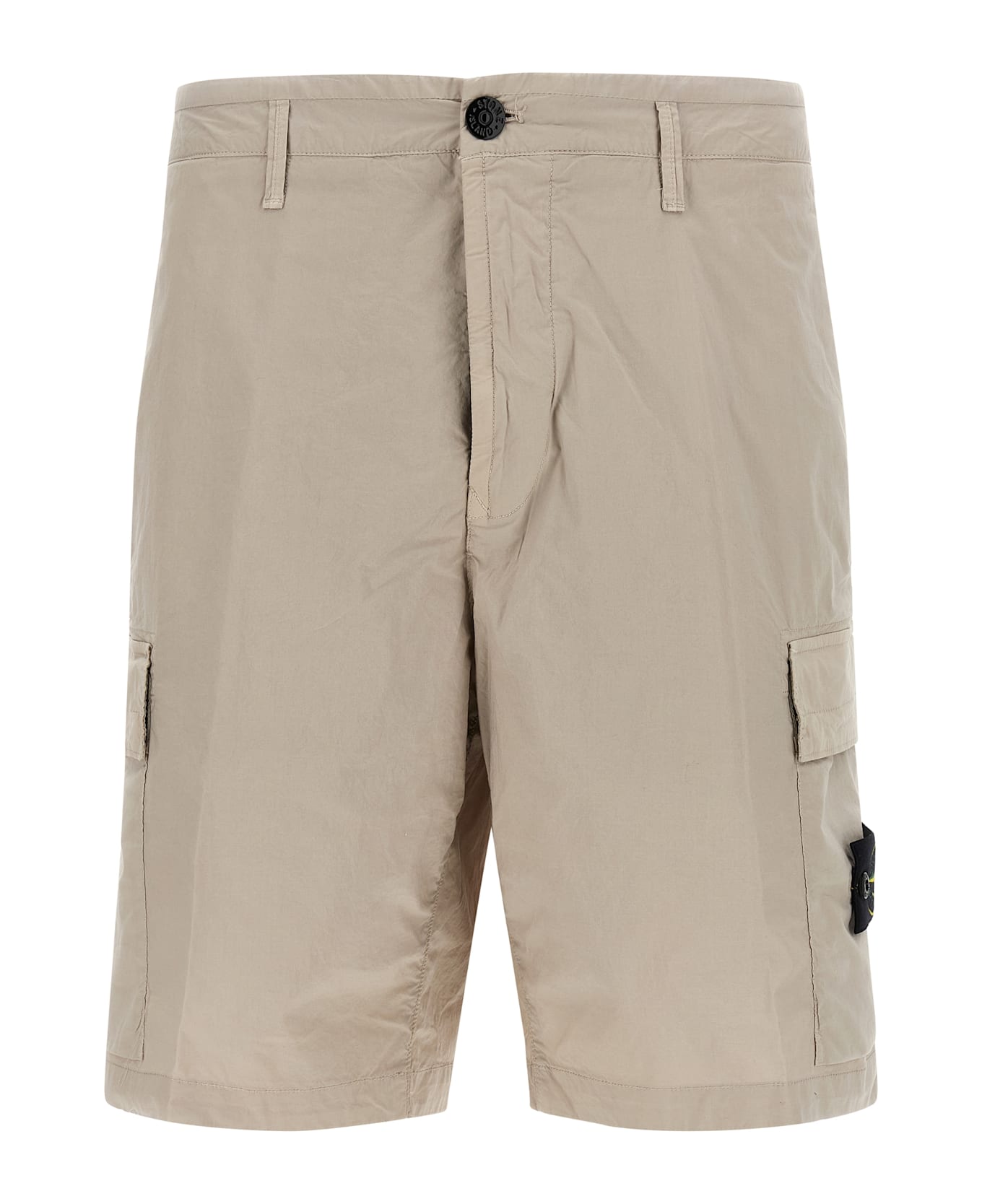 'L100020' bermuda shorts in light 'Paracadute' garment-dyed stretch cotton canvas, cargo style with side pockets and logo badge, zip and front button closure, pockets. Composition: 97% cotton, 3% elastane