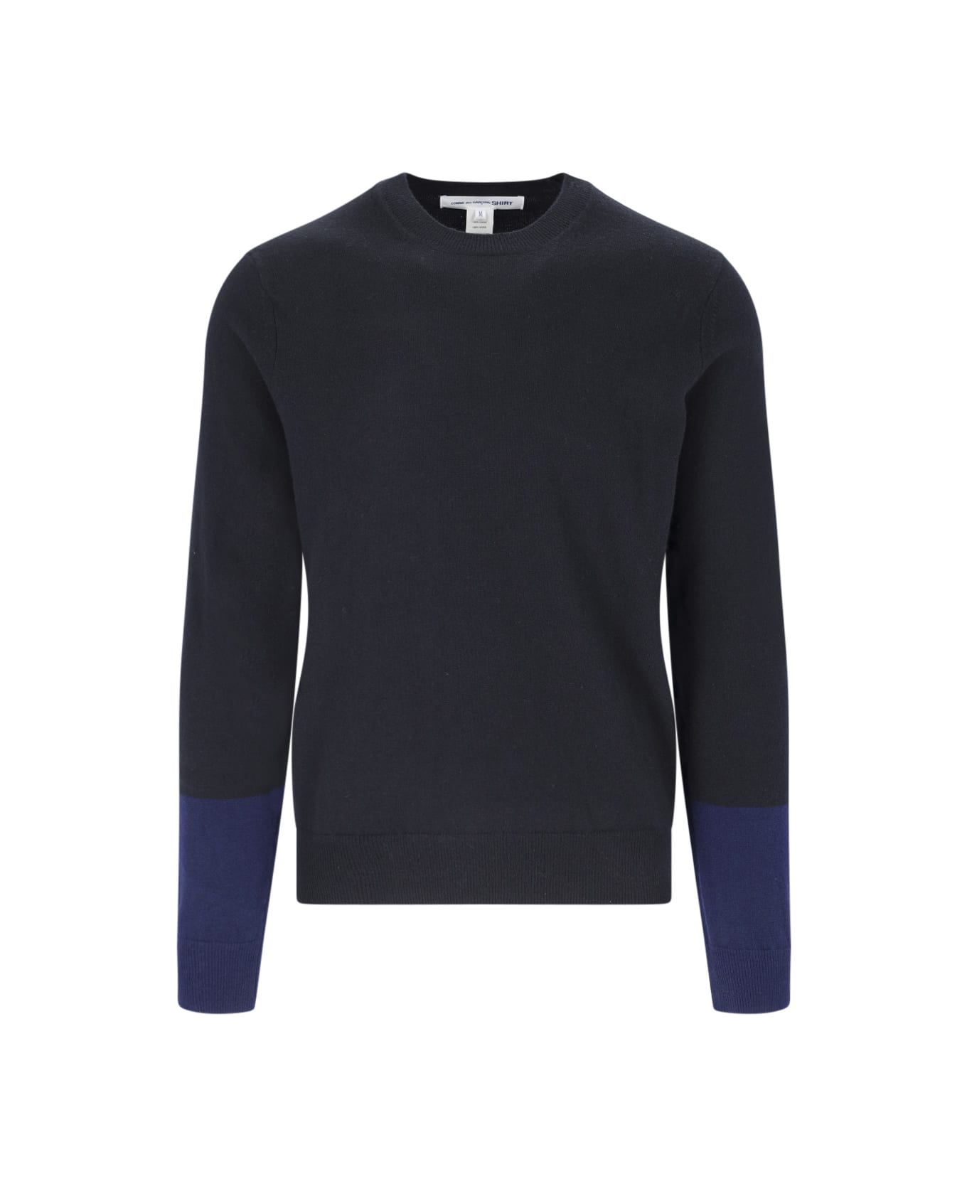 Comme des Garçons Color Block sweater in black wool with blue details, crewneck, ribbed trim, and straight hem. Composition: 100% Wool