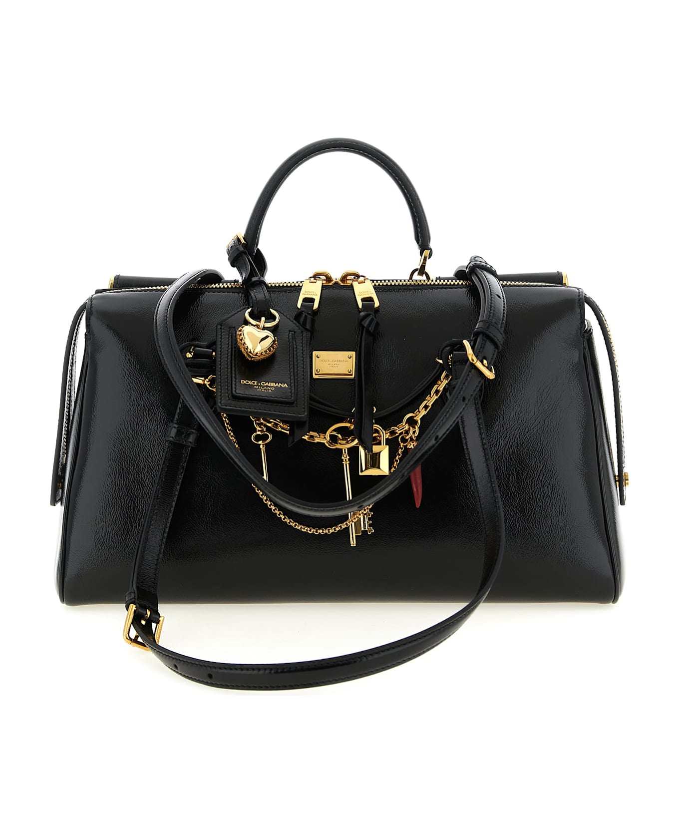 'Vittoria' medium handbag in calf leather, doctor bag model, vintage brass galvanic metal details, metal monogalvanic tag with engraved logo and chain detail with front charms, fixed hand handle, double adjustable shoulder handle, top zip closure, name tag with removable jewel charm, embossed logo and back zip pocket, rigid base with metal feet.