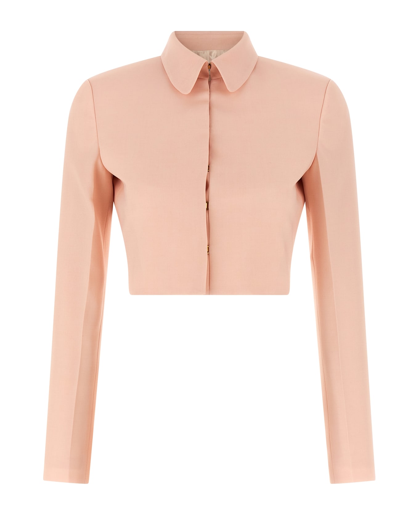 Tropical wool bolero blazer with shirt collar, front hook closure, structured shoulder strap, long sleeves, monogram viscose lining. Composition: 54% polyester 44% wool 2% elastane