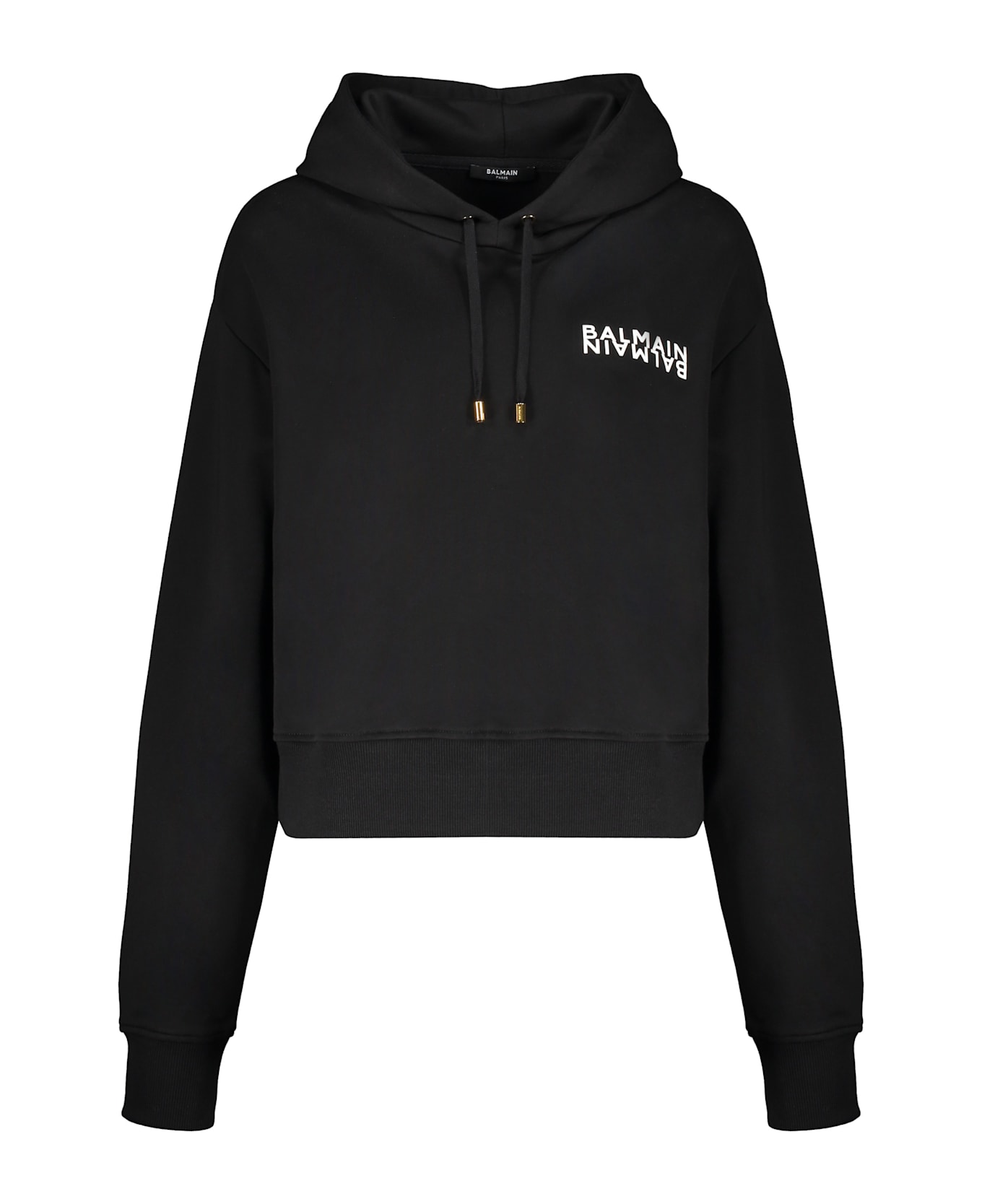 Black sweatshirt made of soft fabric, equipped with a hood and adjustable drawstrings. features a simple yet elegant design with a logo printed on the front. the fit is comfortable and ideal for a casual look. perfect for versatile combinations, it can be worn with jeans or sports pants.